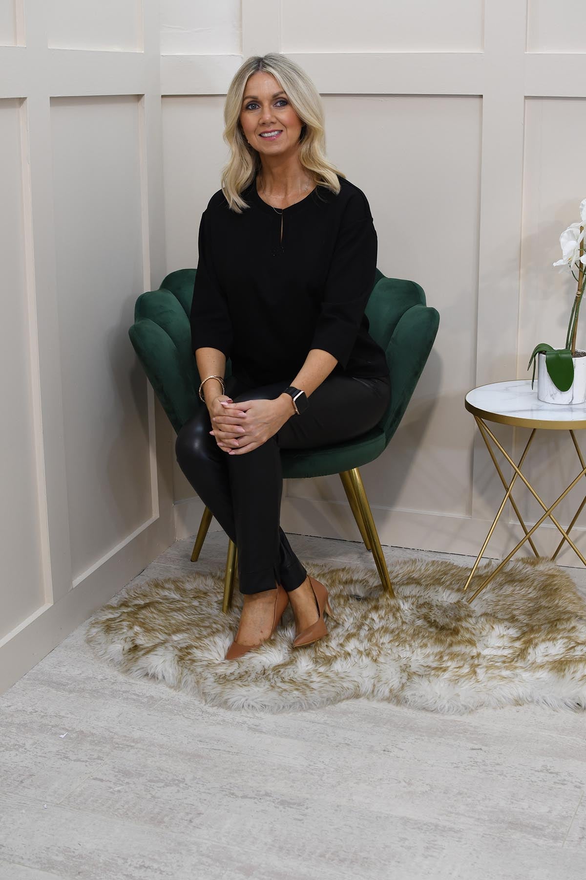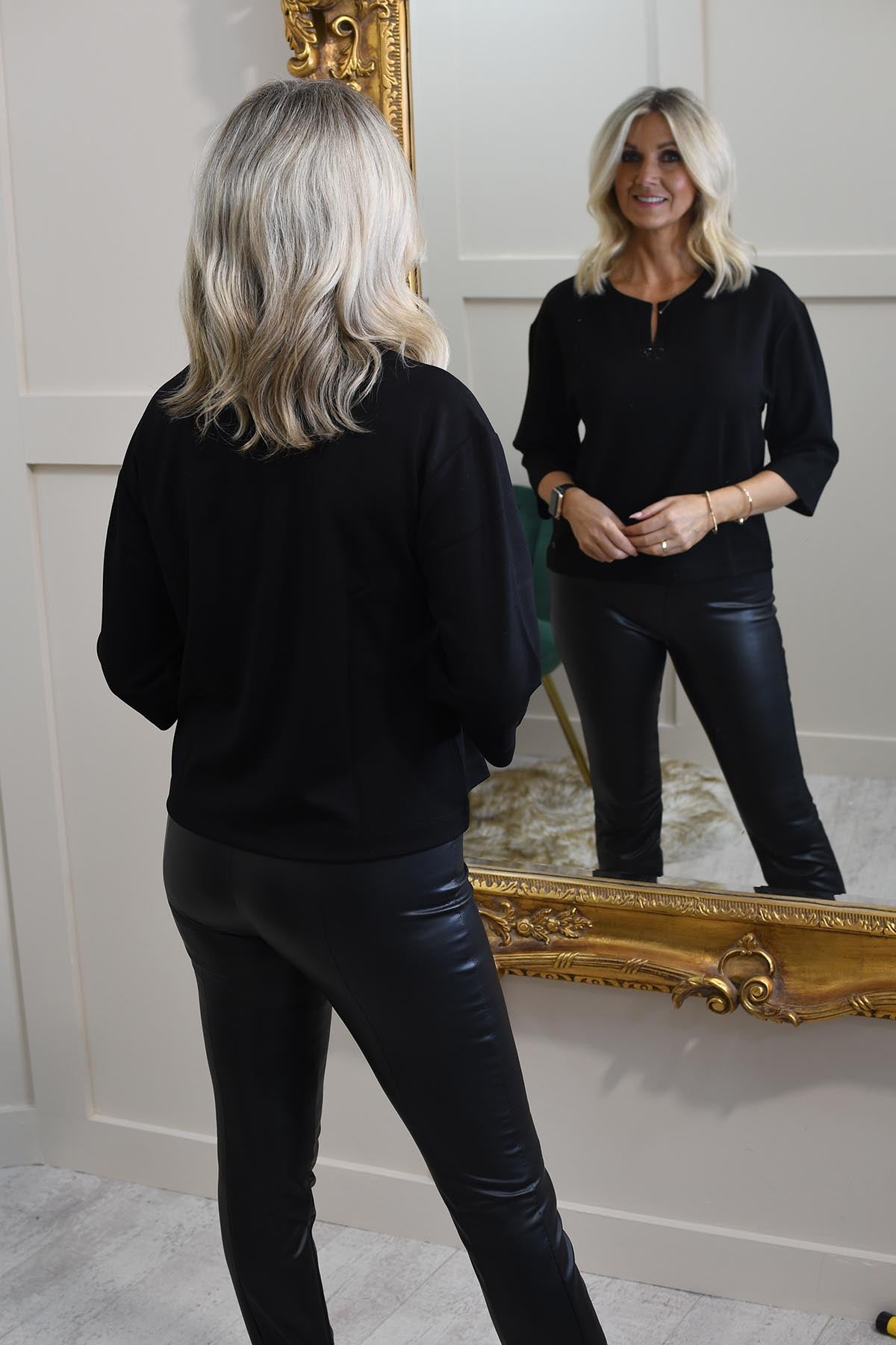 Elevate your everyday look with the Monari Black Box Sweater with Diamante Detail, a standout piece from the Montana collection. Made from a soft, stretchy blend of 80% viscose, 15% polyester, and 5% elastane, this sweater offers a luxurious feel with all-day comfort. The relaxed boxy silhouette is complemented by a flattering V-neckline, finished with subtle black diamante embellishment for a touch of understated glamour. Perfect for pairing with jeans or smart trousers, it adds effortless style to casual days or dressed-down evenings. This sweater combines chic design with comfort in a modern, versatile piece.