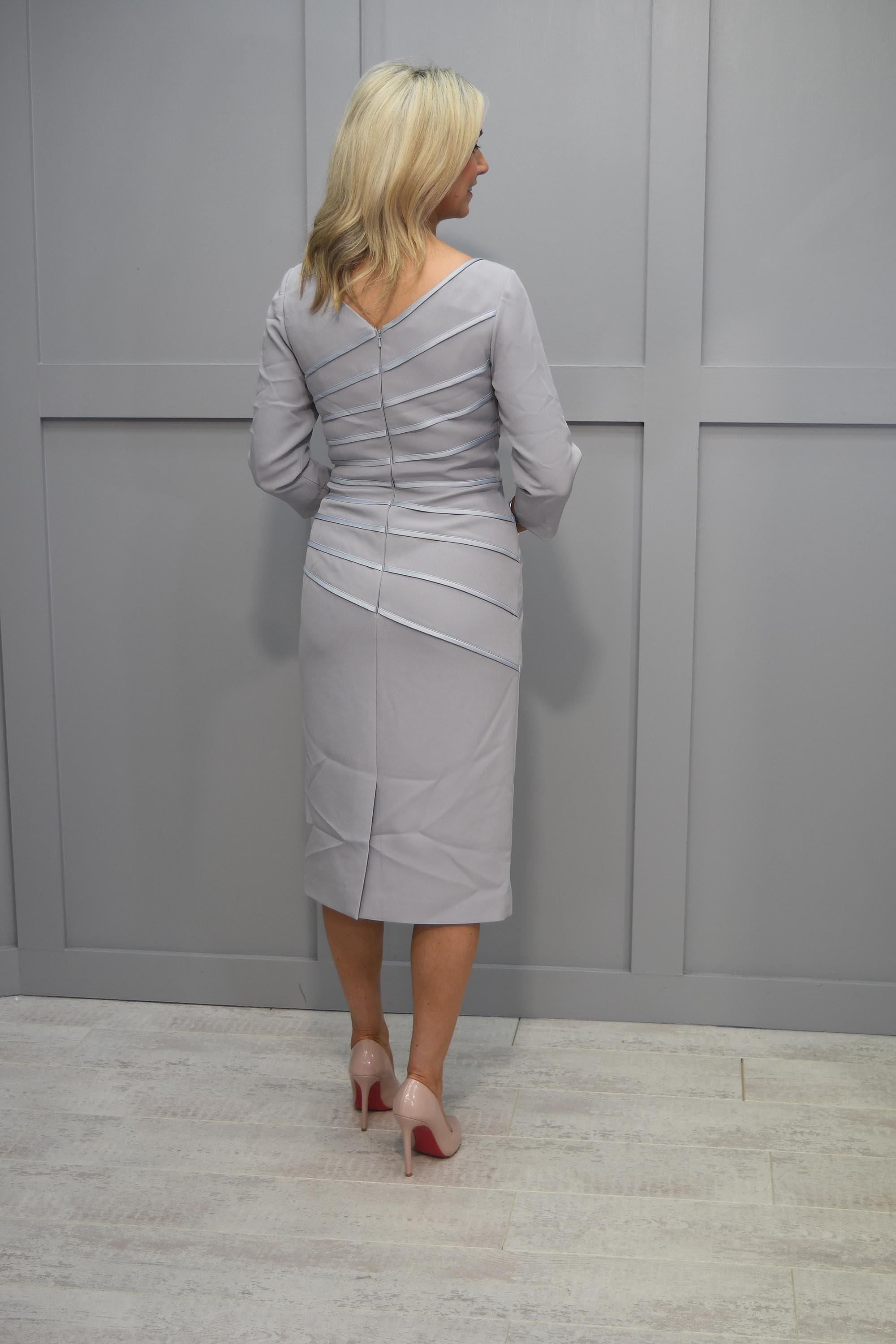 Irresistible Dove Grey Straight Dress With Silver Stripe & Beaded Detail Description