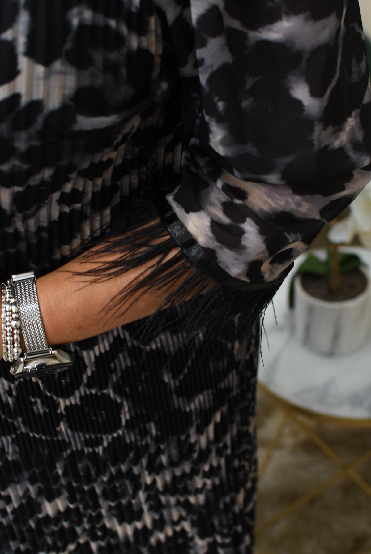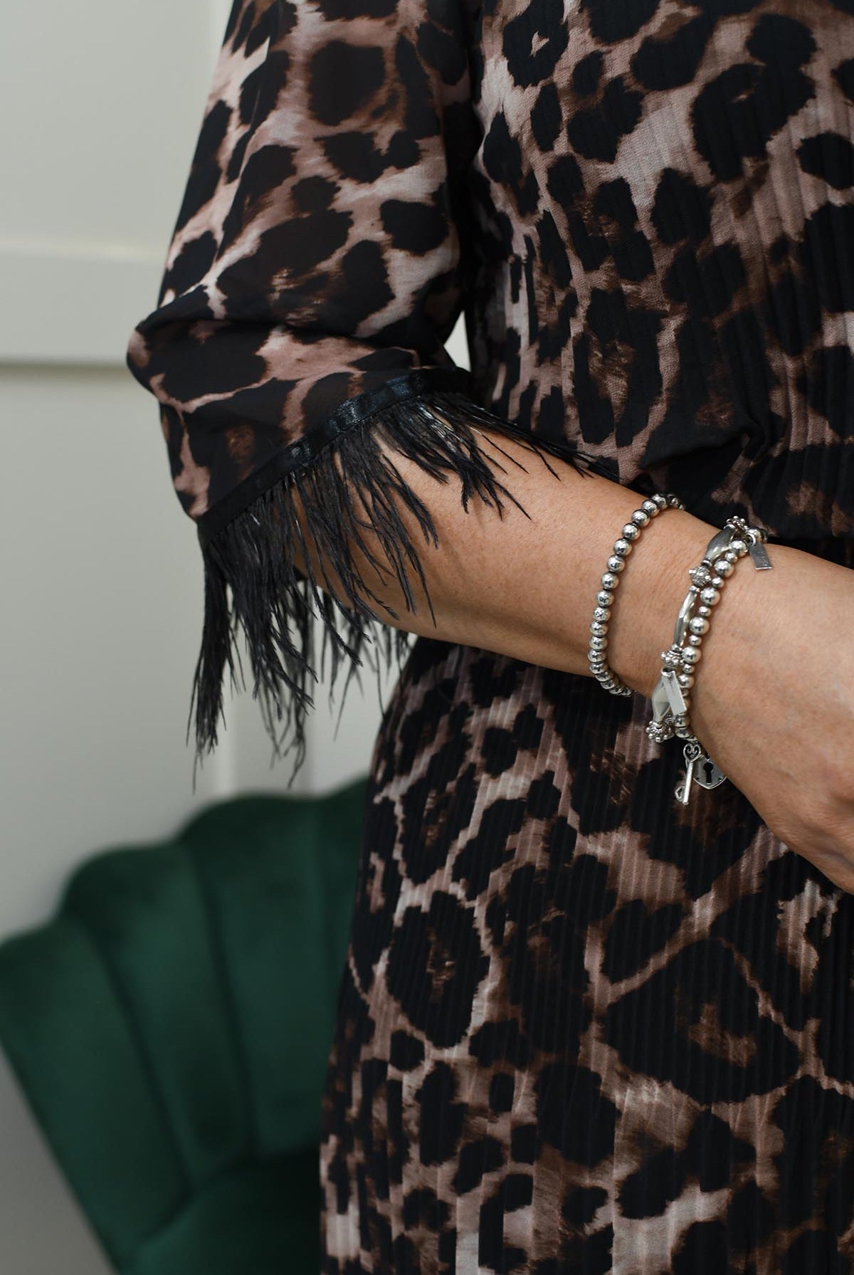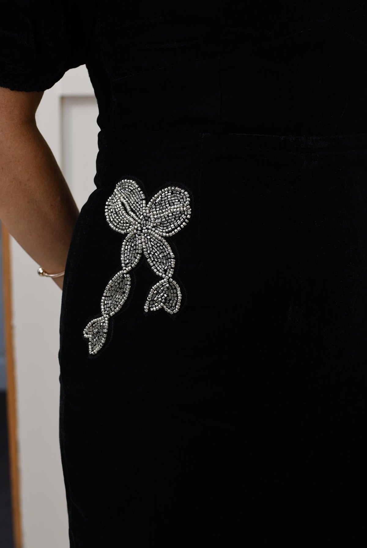 Pair this dress with neutral or silver accessories to complement the silver stripe and beaded detail. Opt for sleek heels and elegant jewellery to complete the sophisticated look.