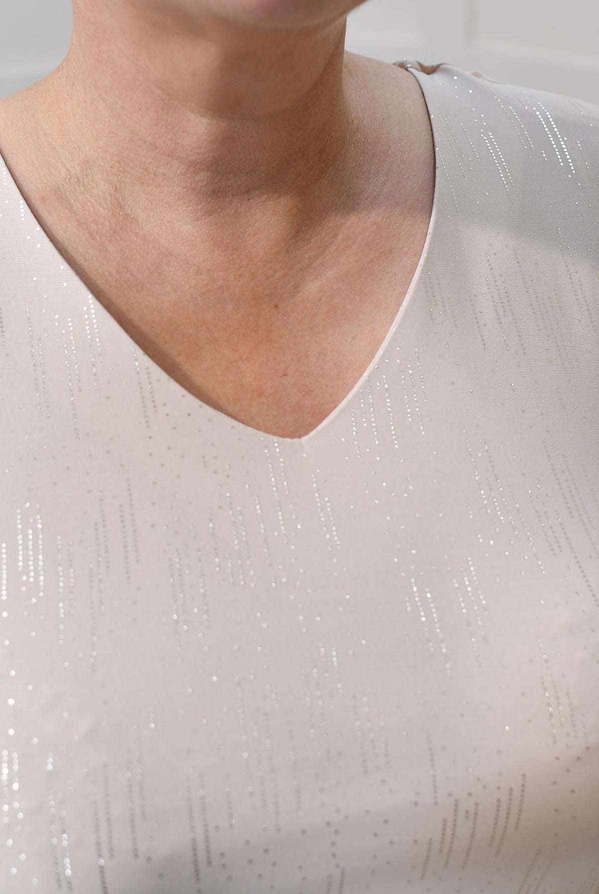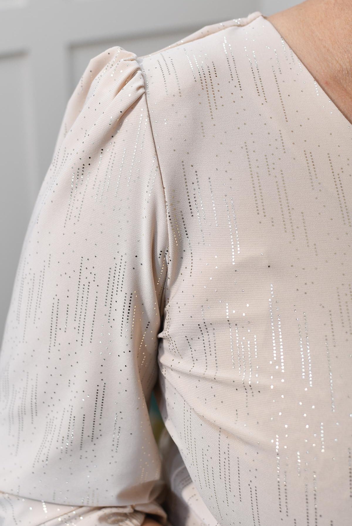 The dress features a dove grey colour, exuding a sense of refinement and class. The addition of silver stripes adds a delicate and feminine contrast to the overall design.