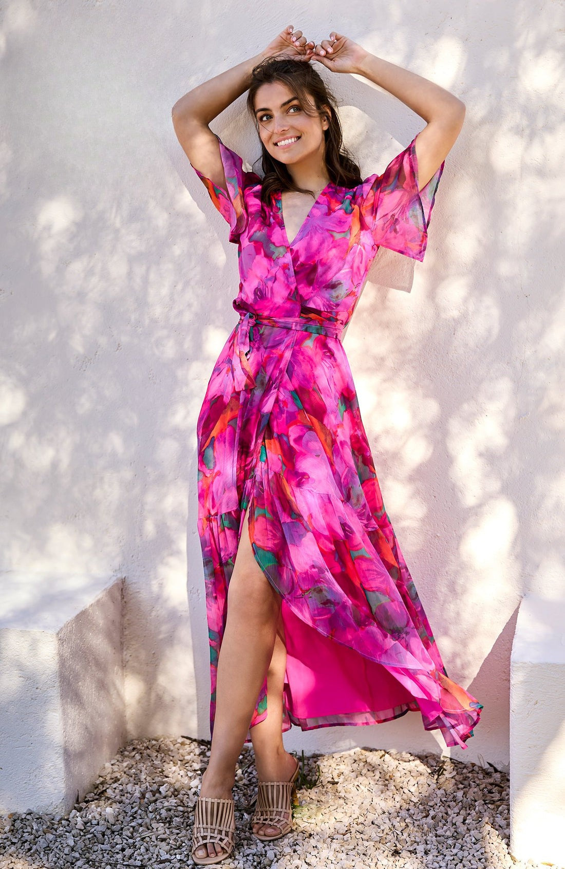 Grace every occasion in the Hope & Ivy Pink Floral Flutter Sleeve Maxi Wrap Dress – Corinne, a versatile piece crafted from 100% recycled polyester. This eco-conscious dress features a flattering wrap silhouette, delicate flutter sleeves, and a feminine tie waist that enhances every figure. The romantic pink floral print brings effortless elegance, while the maxi length makes it ideal for both casual daytime outings and formal evening events. A key detail—its flattering wrap fit—offers style and adjustability in one. Beautifully sustainable and endlessly wearable, Corinne is your go-to dress for weddings, brunches, and everything in between.