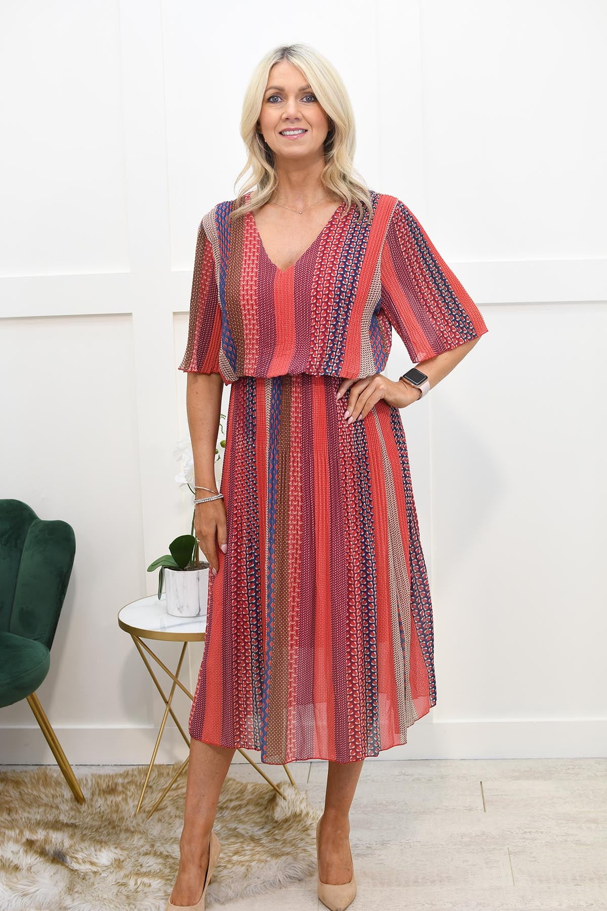 Kyla Burnt Orange, Plum & Blue Mixed Print Plisse Dress Description