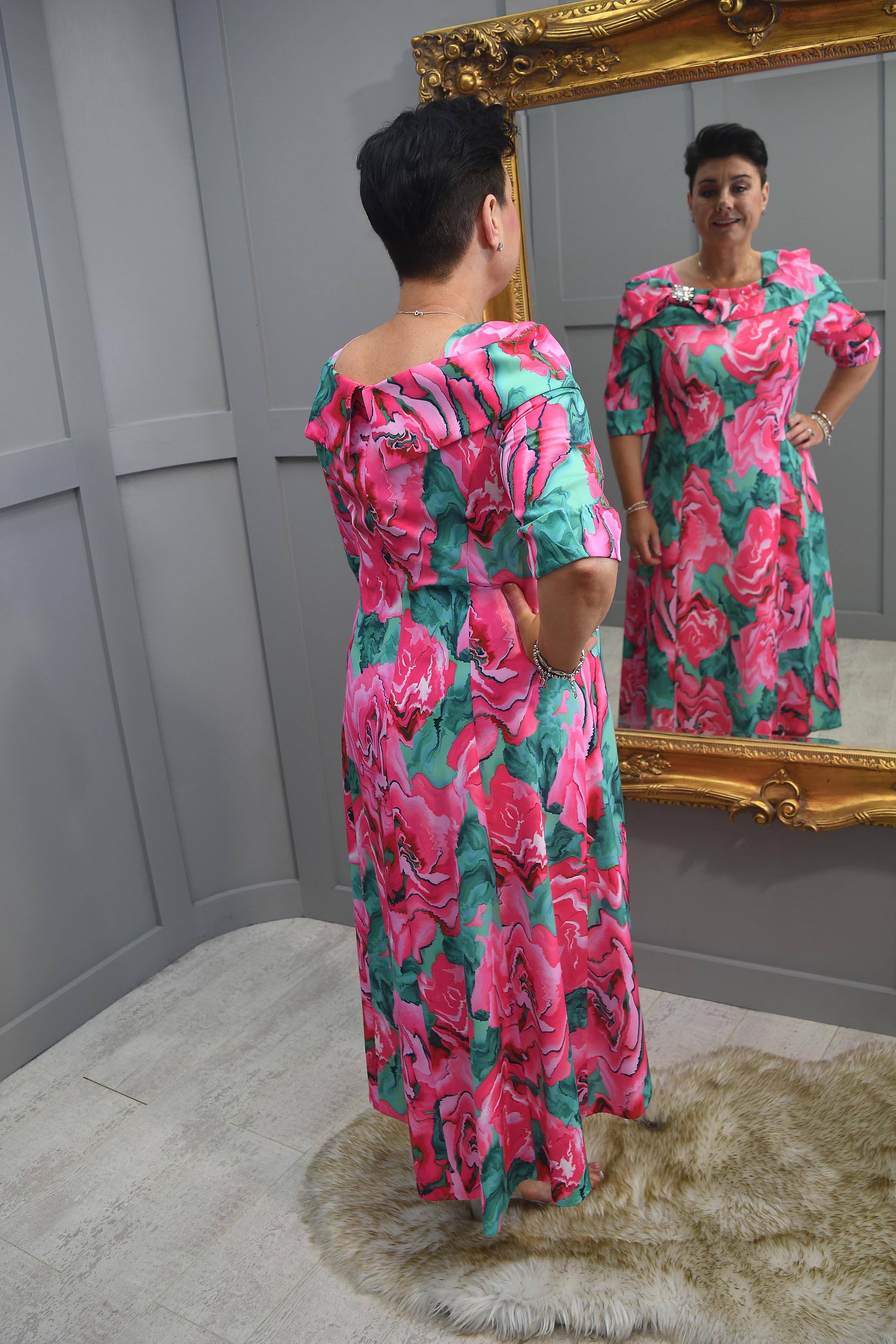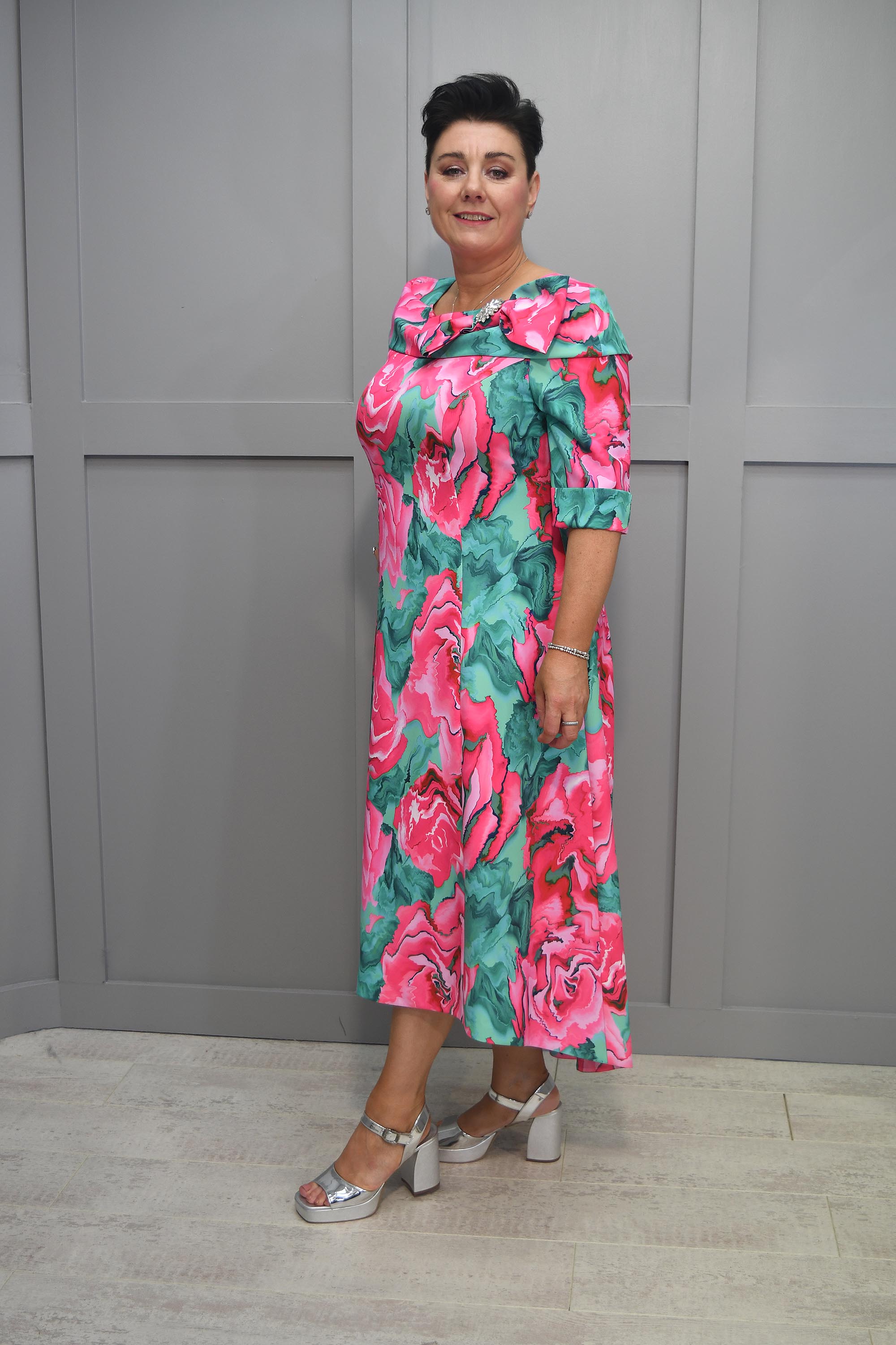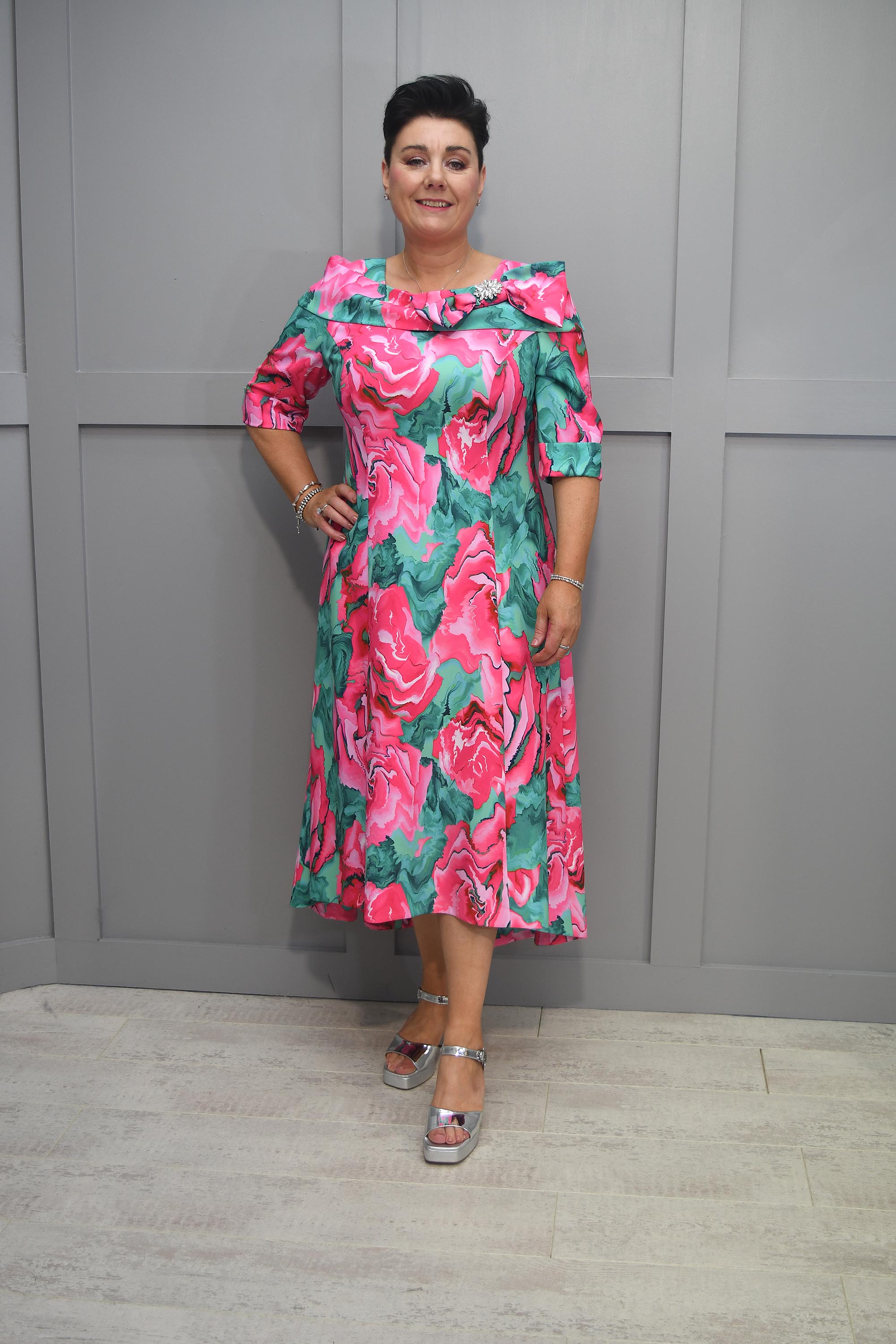 Cassandra Pink & Green Abstract Print Dipped Hem Dress With Bow & Brooch Detail- Martha B 924