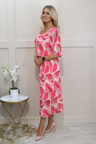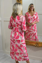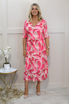 Elevate your wardrobe with the Kyla Pink, Beige & Cream Print Plisse Dress, crafted from a soft, lightweight plissé fabric that offers a flattering drape and effortless movement. Designed with 95% viscose and 5% elastic, this breathable, stretch-enhanced dress ensures all-day comfort and a flexible fit. The elegant pink, beige, and cream abstract print adds a chic, contemporary touch, making it perfect for both daytime events and evening outings. Its easy-care, wrinkle-resistant texture makes it ideal for travel or on-the-go style. A must-have in your collection, this printed midi dress combines comfort, elegance, and versatility. Perfect for spring and summer fashion.