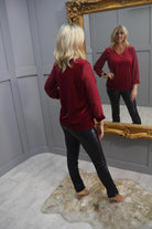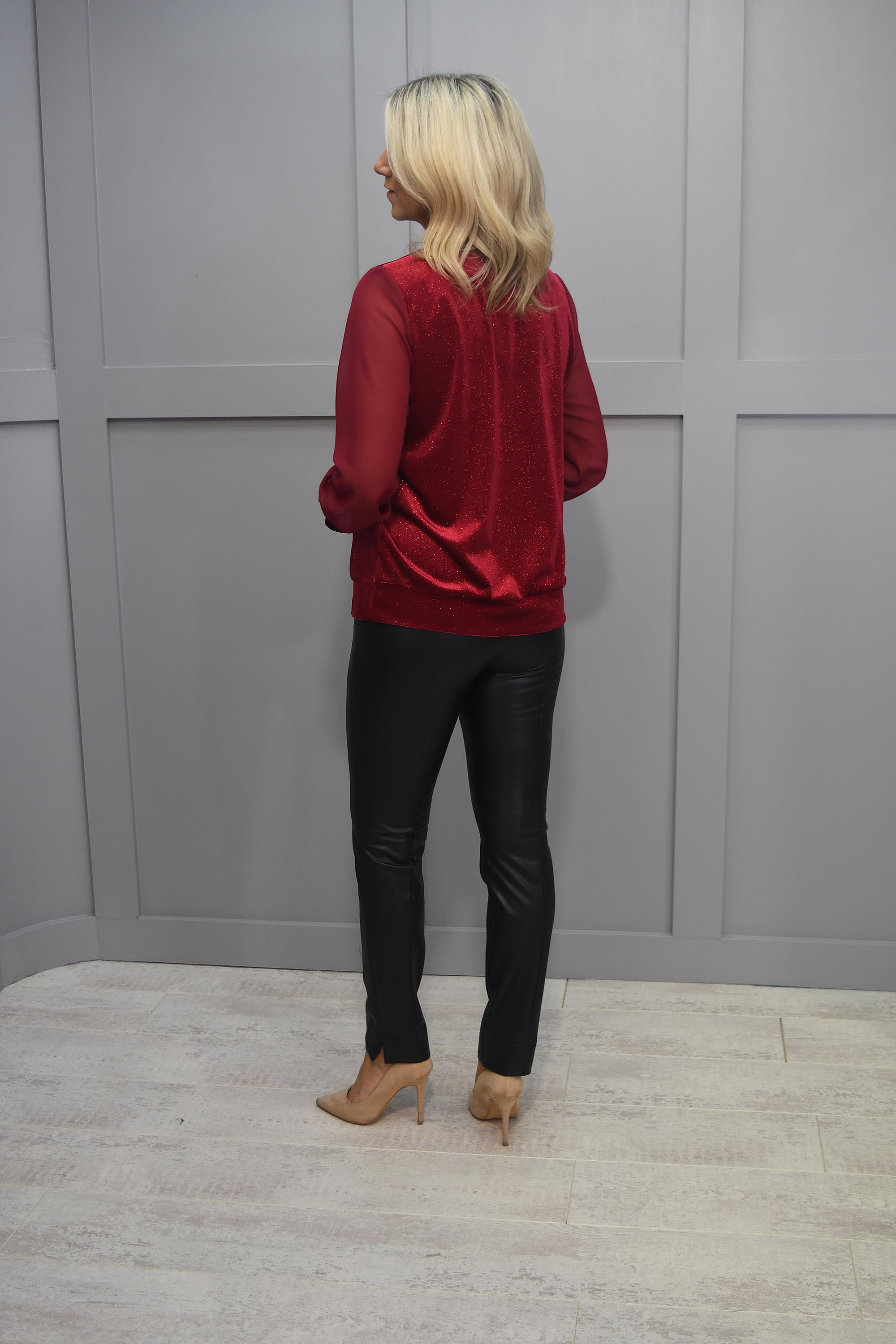 The deep red colour of this top exudes a sense of luxury and elegance, making it an ideal choice for adding a touch of refinement to your outfit. The subtle sparkle details throughout the fabric catch the light, creating a subtle shimmer that adds a hint of glamour to your ensemble.