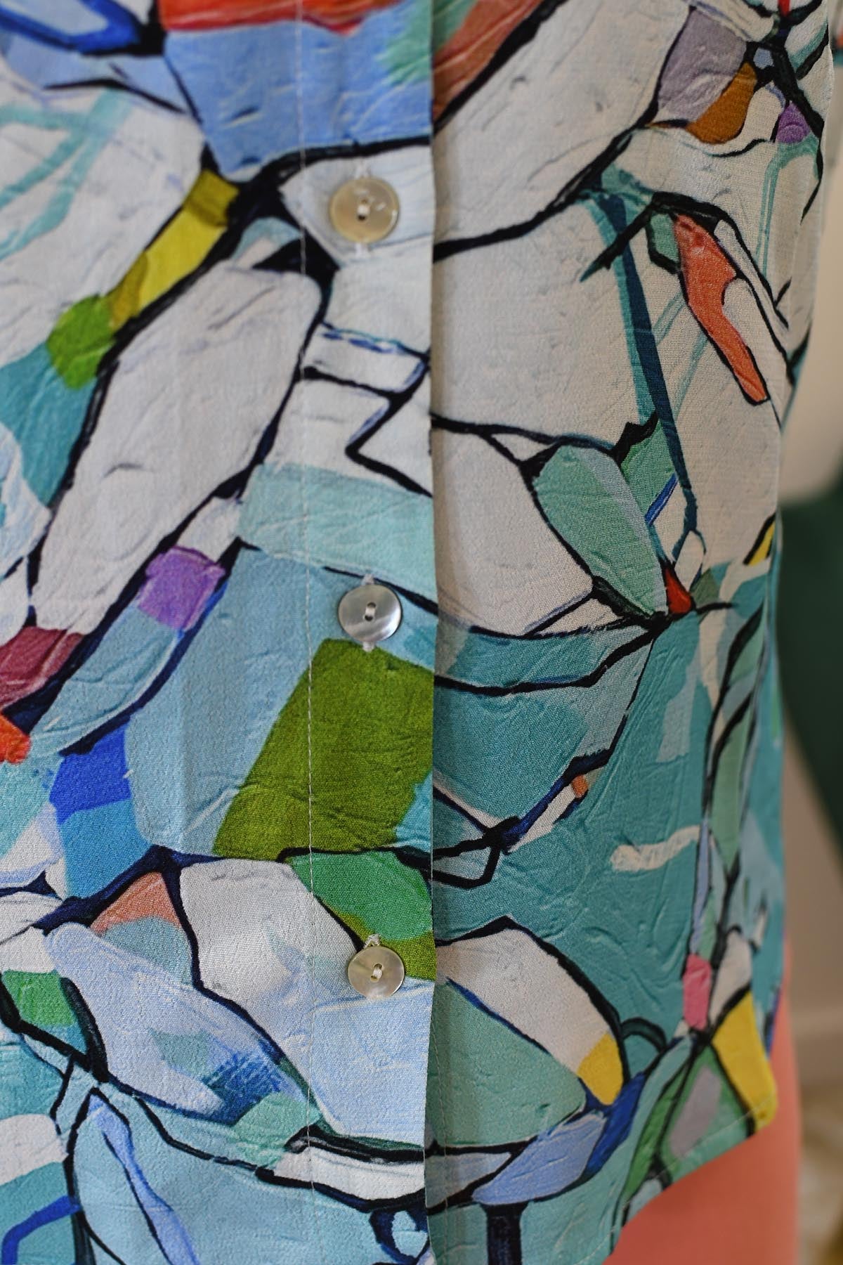 Make a vibrant style statement with the Dolcezza Multicolour Abstract Print Button-Up Blouse from the Half Moon Morning Collection. Crafted from 100% viscose, this lightweight and breathable blouse drapes beautifully for a flattering fit. The eye-catching multicolour abstract print adds artistic flair, while the classic button-up front and relaxed silhouette make it effortlessly chic. Perfect for both casual and dressy occasions, pair it with tailored trousers or jeans to instantly elevate your look. Comfortable and stylish, this blouse is a must-have addition to your wardrobe.