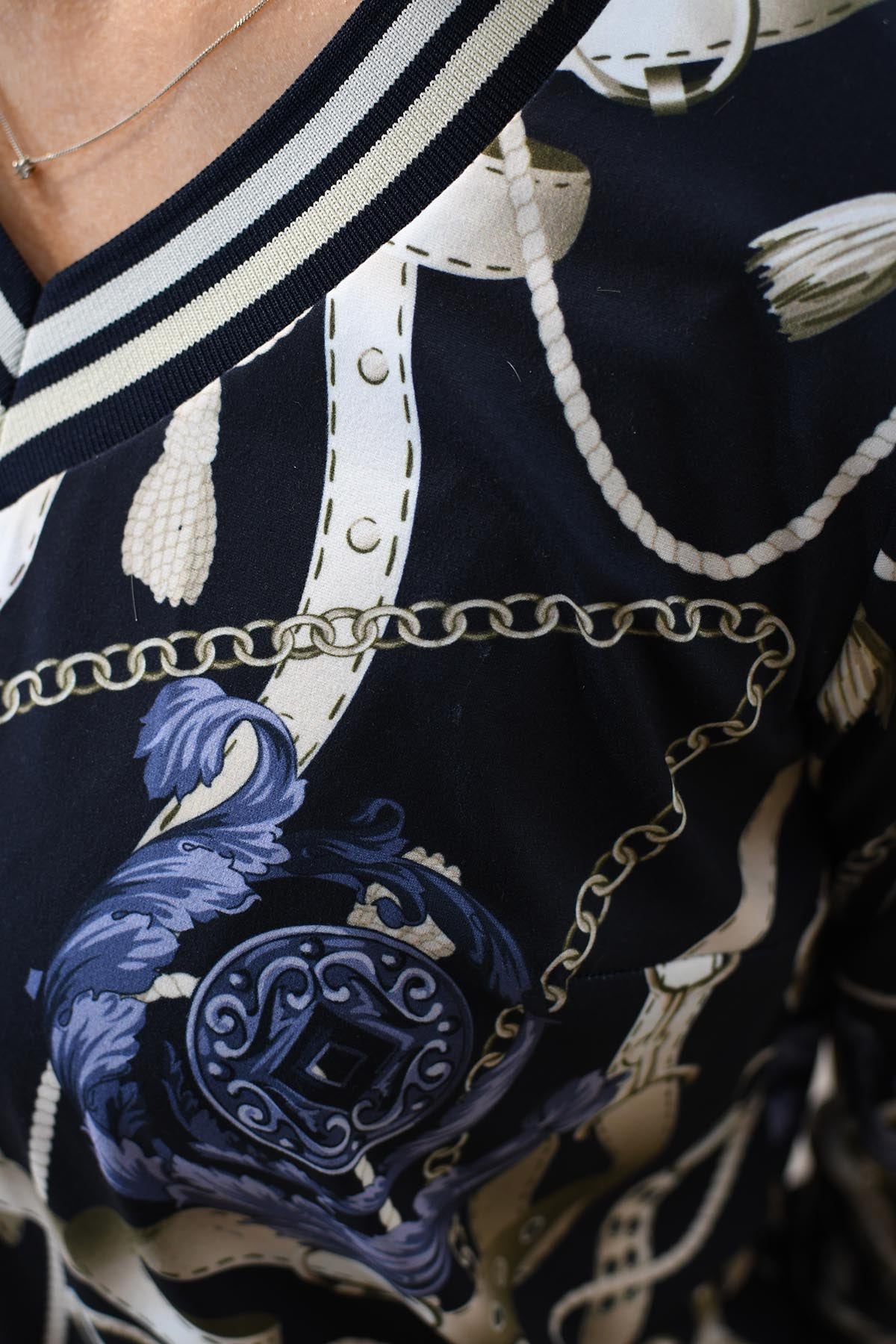 YEW Navy & Gold Belt Print Top With Sports Cuff-3825 Tina