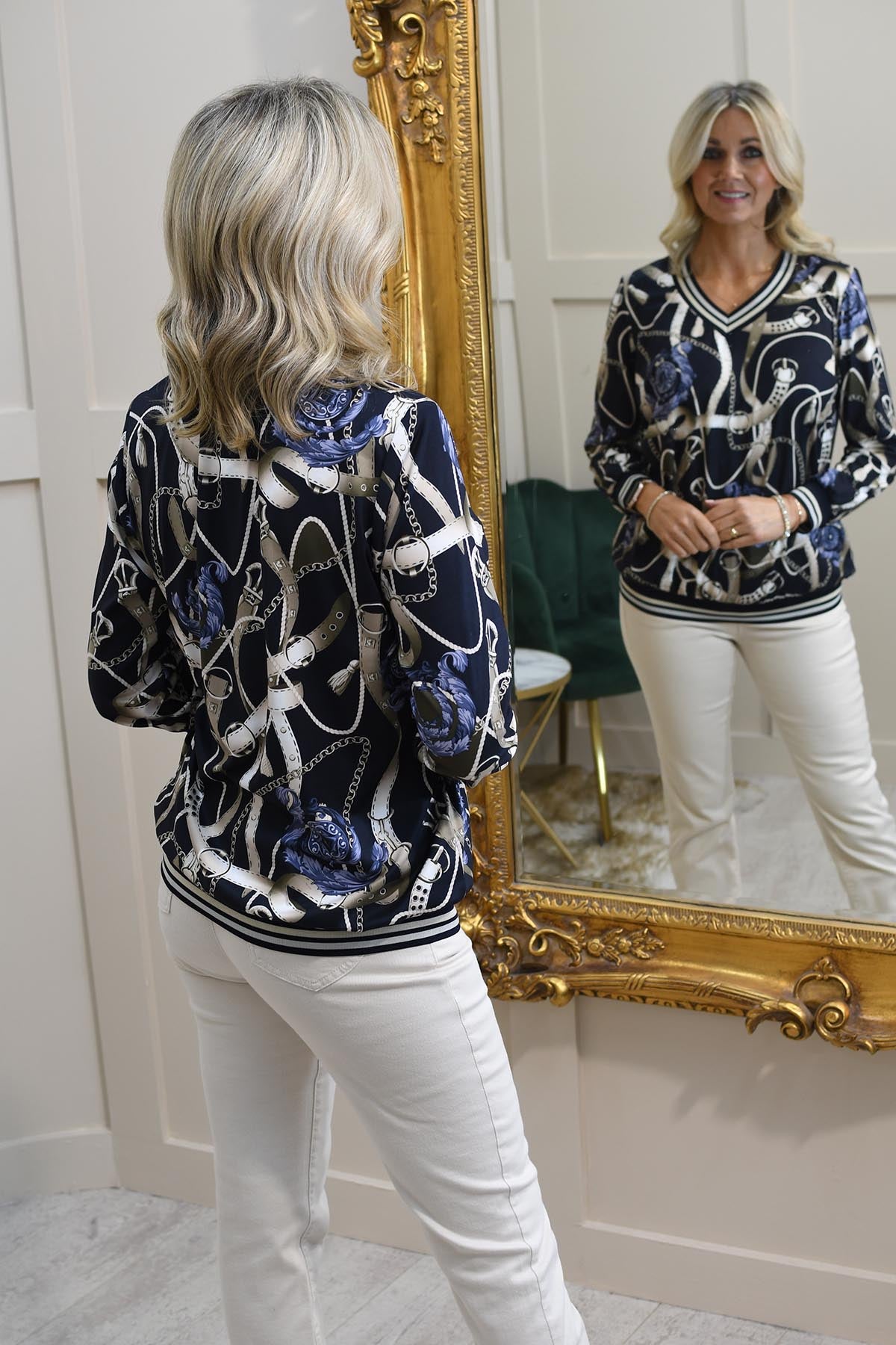 Elevate your wardrobe with the YEW Navy & Gold Belt Print Top With Sports Cuff a perfect blend of elegance and sporty sophistication. Crafted from a soft and breathable fabric, this top offers exceptional comfort with a flattering fit. The luxurious gold belt print on a deep navy background exudes timeless charm, while the contrast sports-style cuffs add a modern, casual edge. Featuring a classic round neckline and long sleeves, this versatile piece is perfect for both casual outings and dressier occasions. Pair it with jeans or tailored trousers for a polished yet effortlessly stylish look.