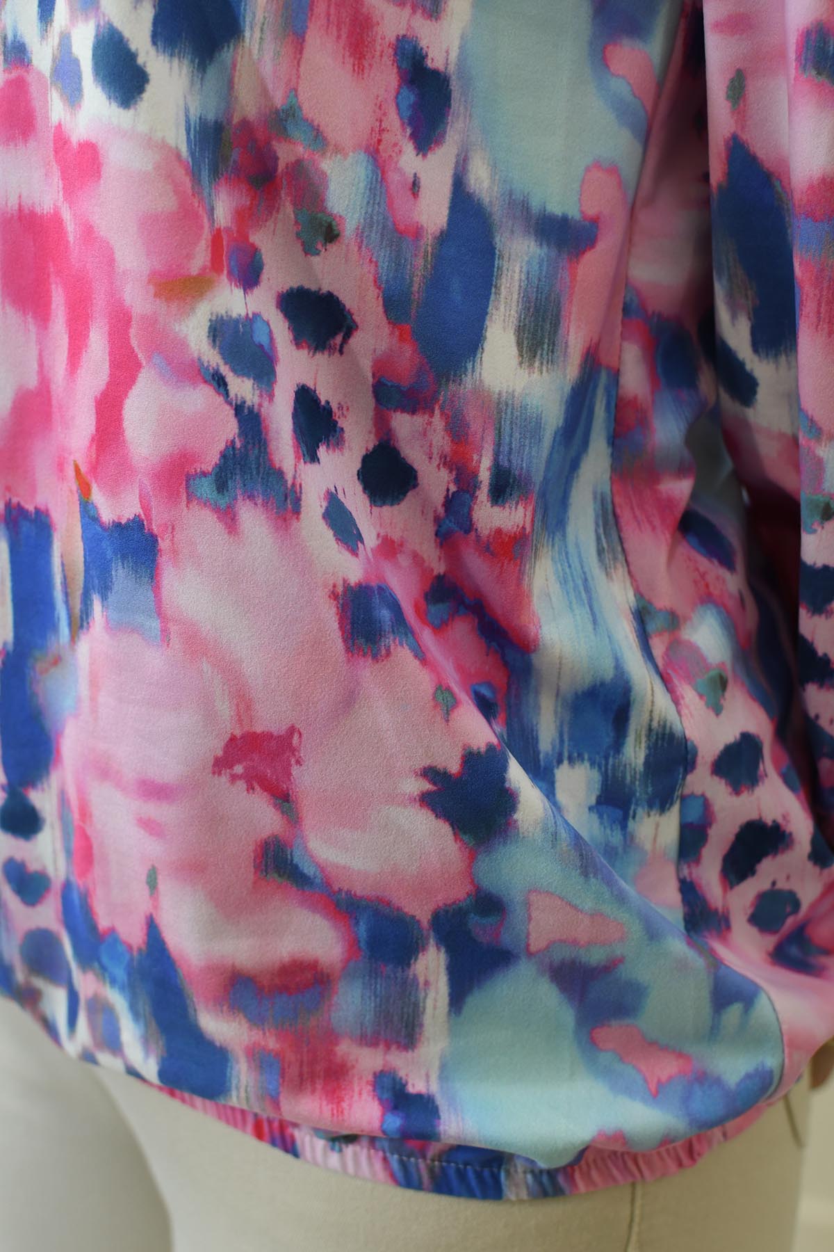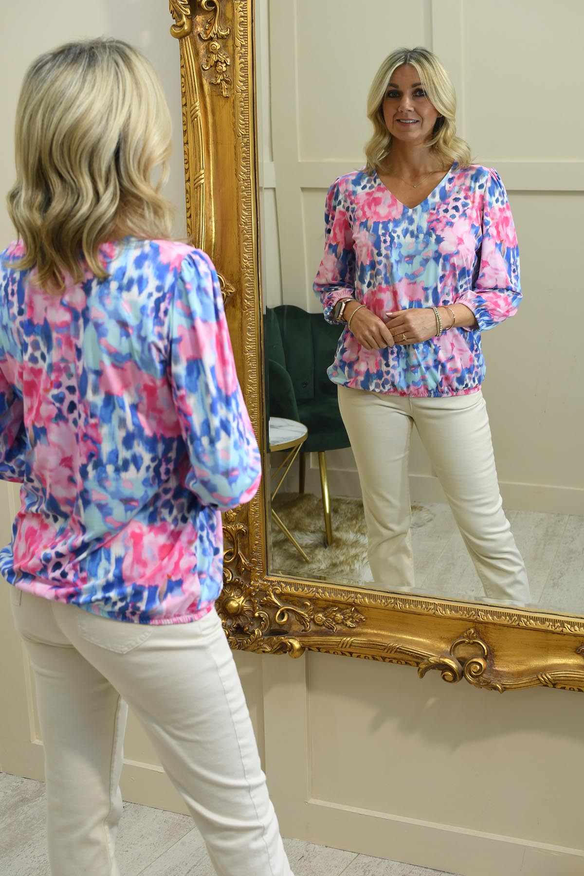 YEW Pink & Blue Abstract Print V Neck Top-4153B Kiki