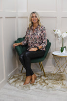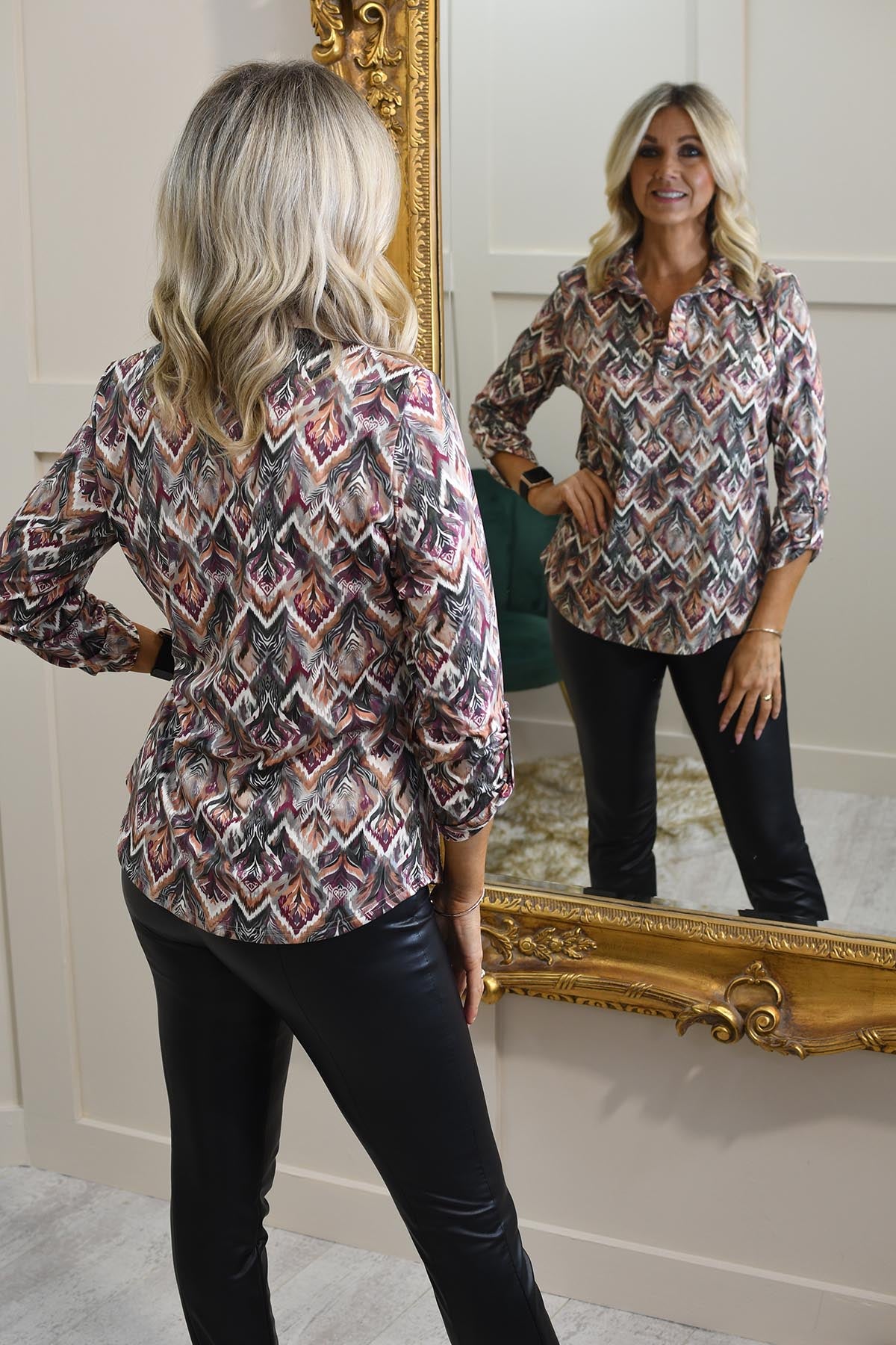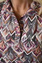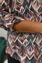 YEW- Plume Pattern 1/4 Button Blouse- Khaki, Burnt Orange & Burgundy- 3743 Selma