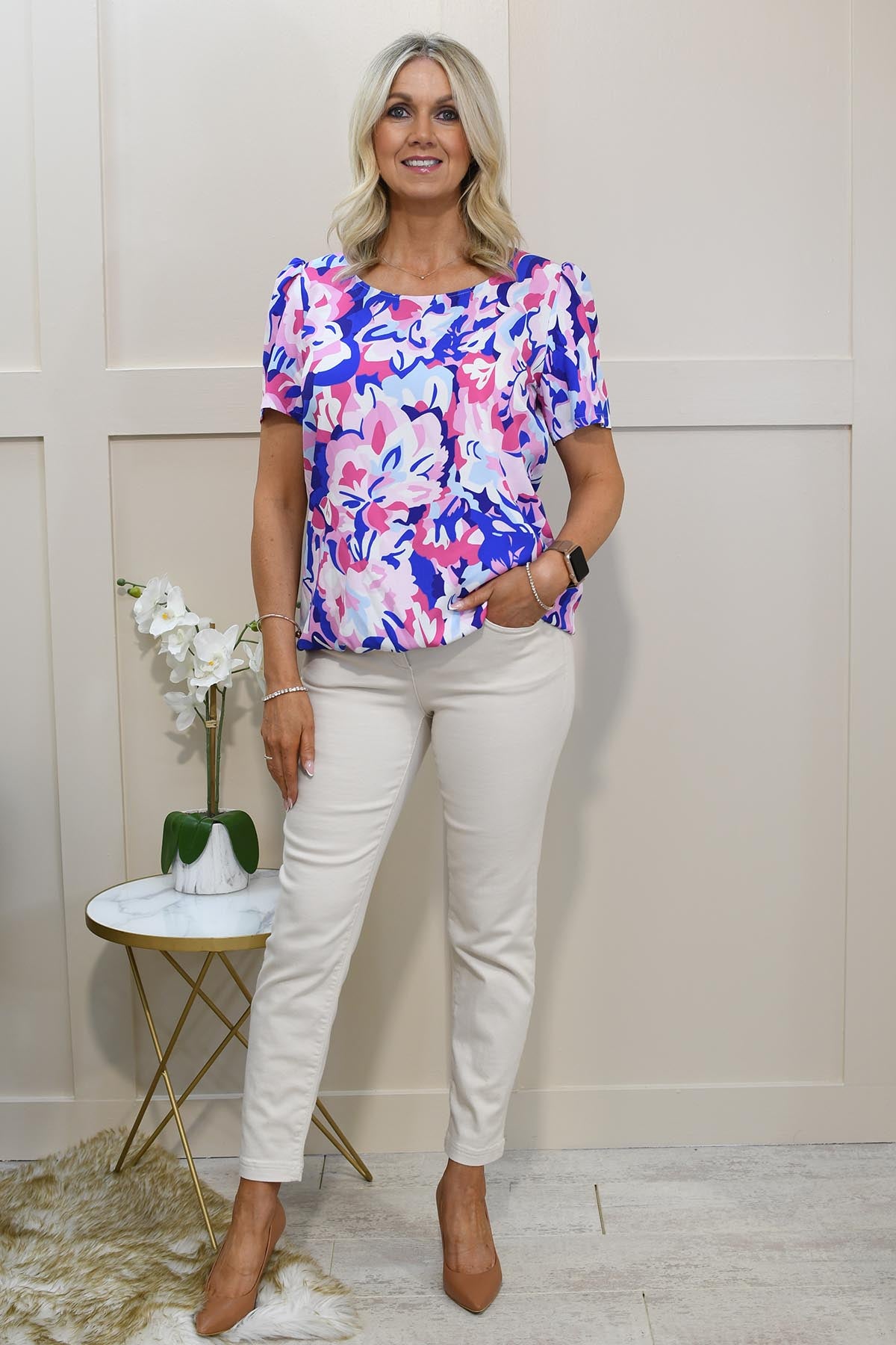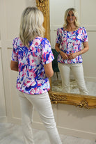 YEW Royal Blue & Pink Floral Print Top With Elasticated Waist- 4152 Claire