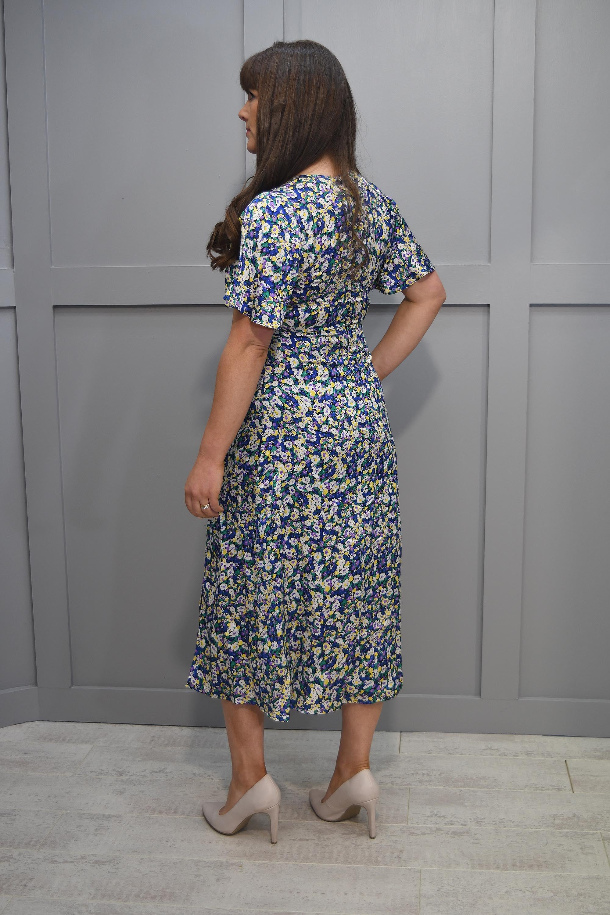 Featuring a delicate floral print in soft pastel hues, this midi dress captures the essence of springtime beauty. The intricate floral motifs cascade gracefully across the fabric, adding a touch of whimsy and romance to the ensemble.