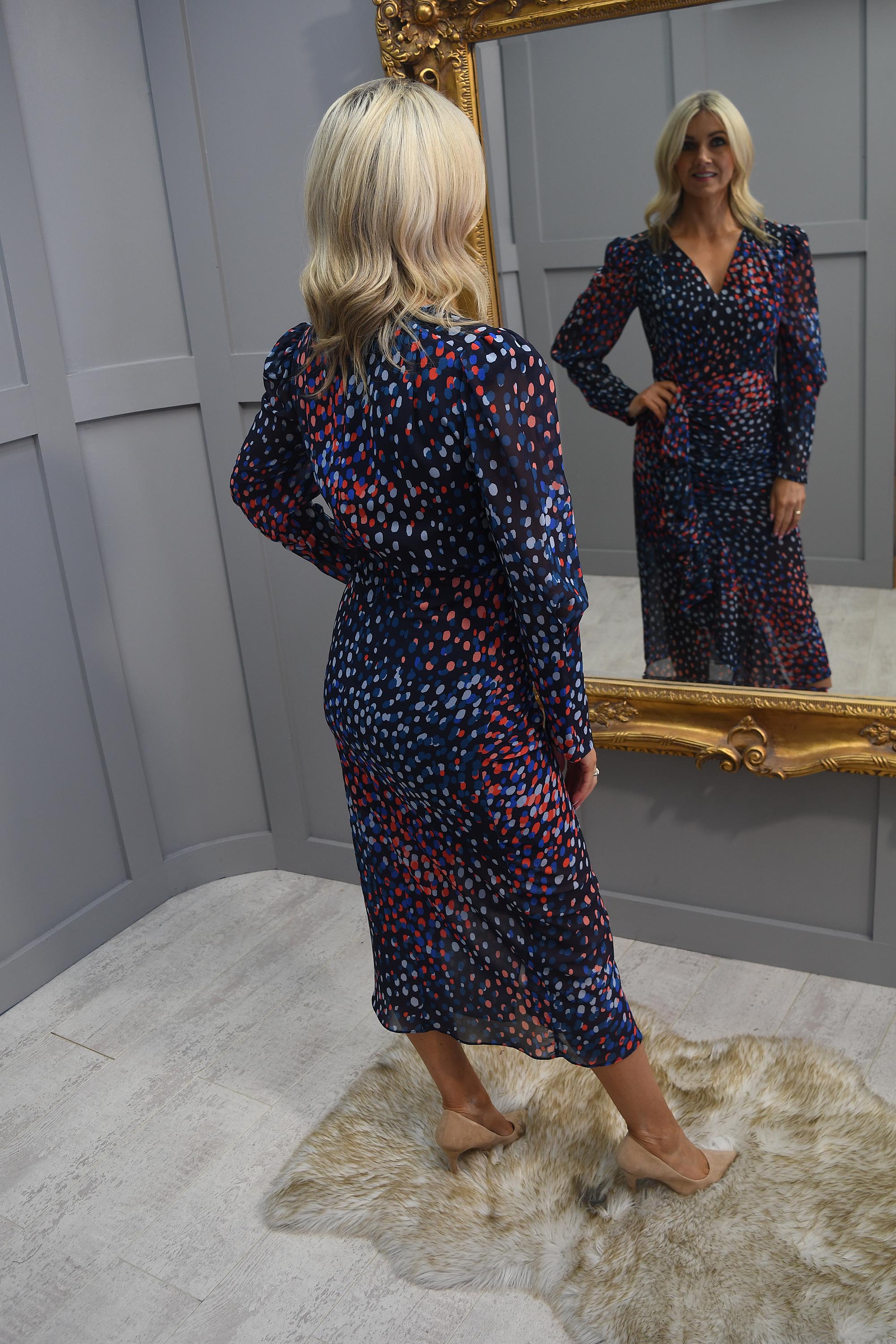 This dress exudes an air of timeless elegance with its meticulously chosen colour palette. The deep navy backdrop serves as the perfect canvas for the vibrant red and royal blue spots, creating a playful yet refined pattern that draws attention and exudes confidence.