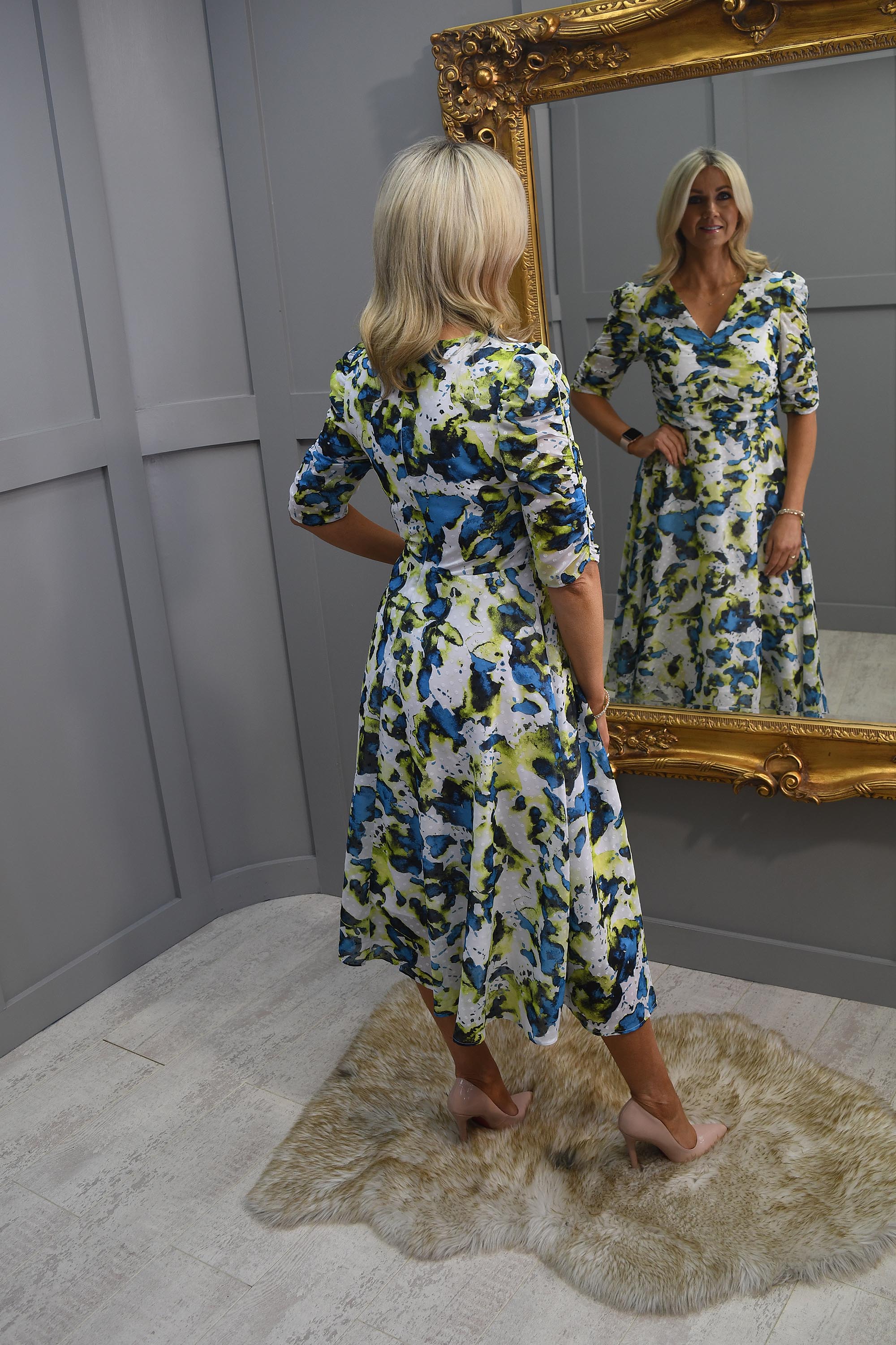 Kate Cooper White, Green & Blue Abstract Print Dress With Ruched Detailing Description