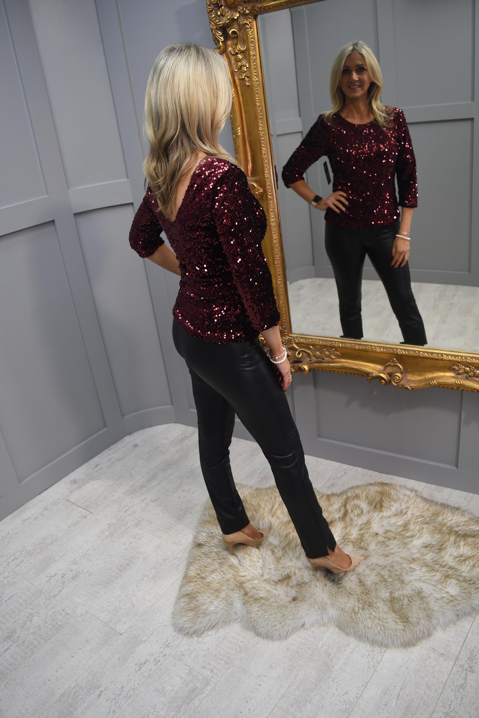 Here are some fresh styling tips for the stunning Rust Sequin Top With Dipped Back by Marc Angelo: