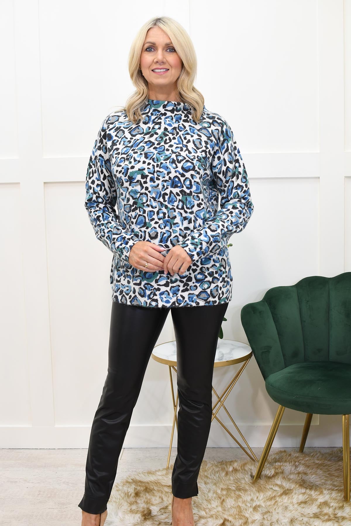 Unleash your wild side with the Barbara Lebek Teal & Turquoise Leopard Print Sweater. This striking piece features a bold leopard print in vibrant shades of teal and turquoise, perfect for making a statement wherever you go. Crafted from a soft and cozy fabric, this sweater ensures you stay warm and comfortable throughout the day.