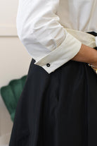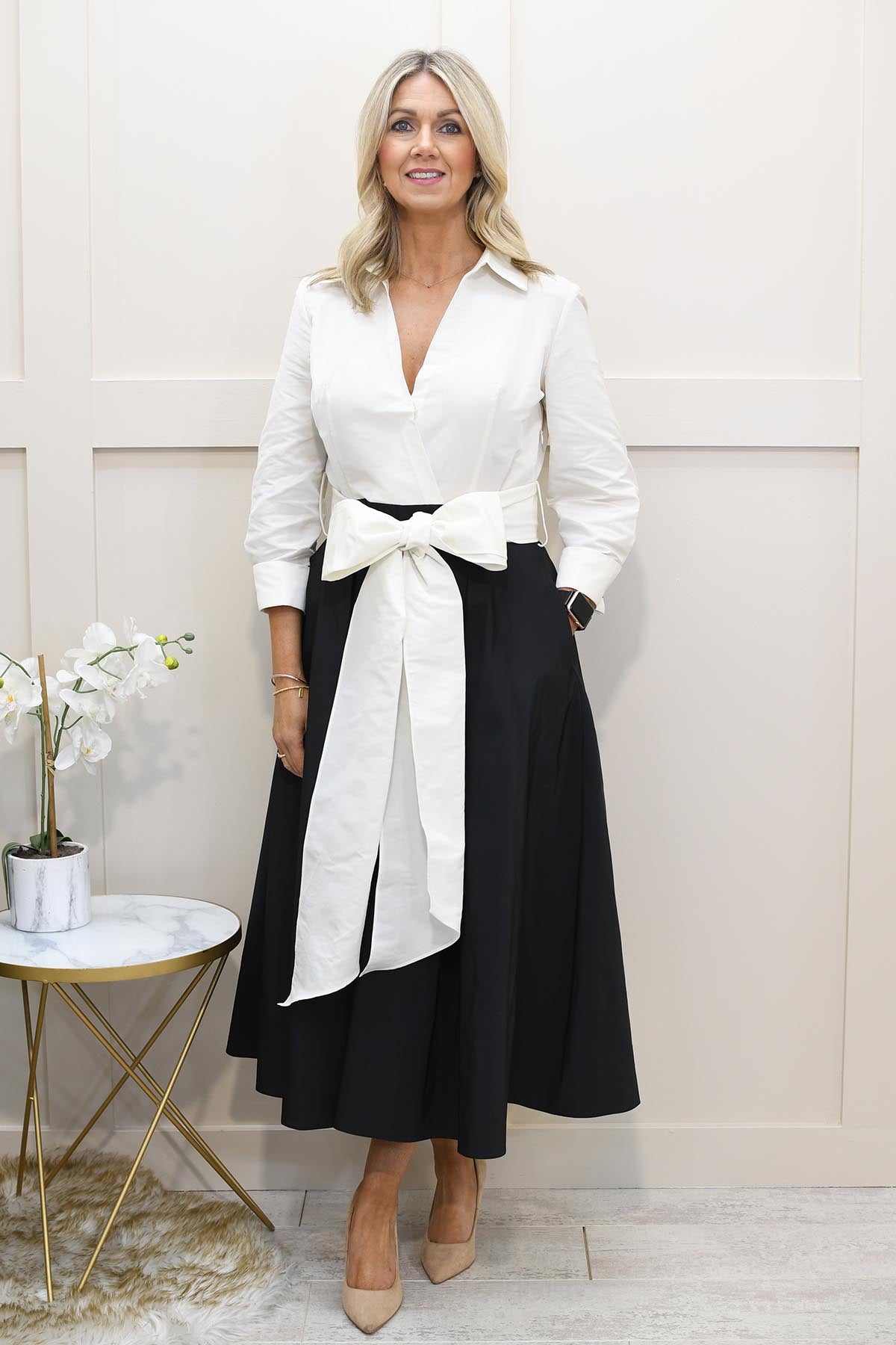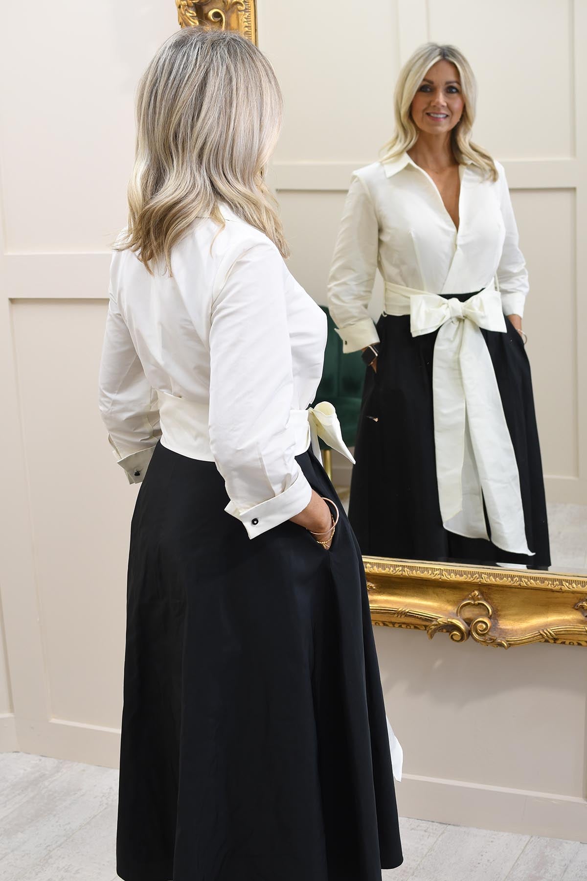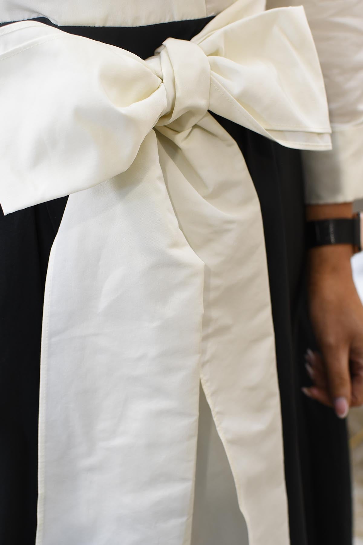 This elegant shirt dress blends sharp tailoring with feminine structure, making it a standout choice for business-formal styling. Crafted from 100% polyester, it offers a smooth, lightweight feel with excellent drape and all-day comfort. The classic shirt-style bodice brings a polished finish, while the full skirt creates movement and a flattering silhouette. Finished with a tie-front bow to define the waist, it enhances shape without compromising comfort. The timeless black and cream colour palette adds sophistication and versatility, making it ideal for professional settings or formal daytime events.