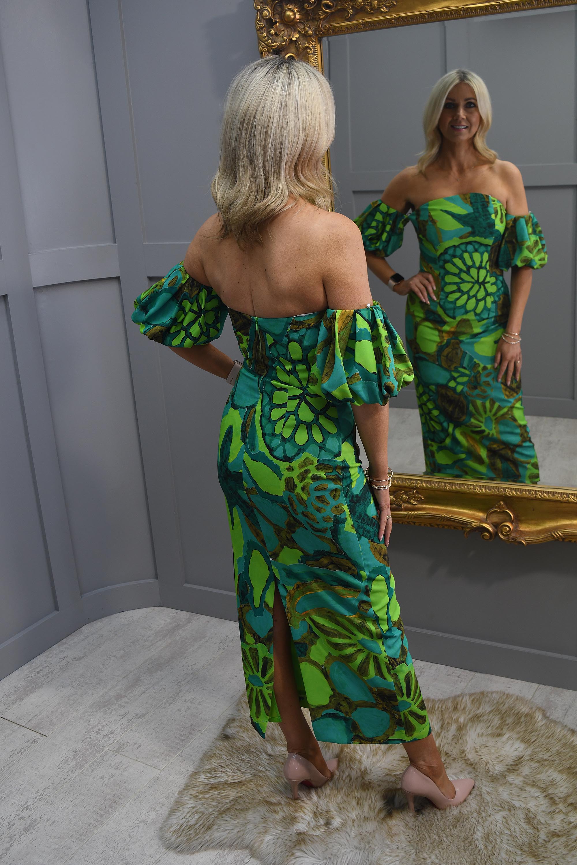 Adorned in a mesmerizing palette of multi-tonal greens, this dress is a celebration of nature's beauty. The thoughtfully designed puff sleeves add a touch of drama and flair, creating a perfect harmony between sophistication and a bold, fashion-forward statement.