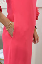 Turn heads in this striking formal shift dress, designed to bring effortless glamour to any special occasion. Crafted from a premium blend of 92% polyester and 8% poliurelano, it offers a smooth, structured finish with a flattering drape and comfortable wear. The classic shift silhouette skims the body beautifully, while the standout feather-trim sleeve cuffs add a dramatic, couture-inspired touch. Finished in a vibrant bright pink, this statement piece is perfect for weddings, race days, or elegant evening events. Style with heels and a clutch for a polished, confidence-boosting look.
