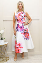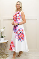 Step into effortless elegance with this white floral print maxi dress crafted from a soft blend of 95% polyester and 5% elastane, offering a smooth feel with comfortable stretch. Designed with a flattering, flowing silhouette, it drapes beautifully while allowing ease of movement. The delicate floral print adds a romantic, feminine touch, making it perfect for special occasions. Lightweight and versatile, this maxi dress is ideal for weddings, garden parties, or summer events. Perfect for those searching for floral maxi dresses, stretch fabrics, or elegant occasionwear that combines comfort with timeless style.
