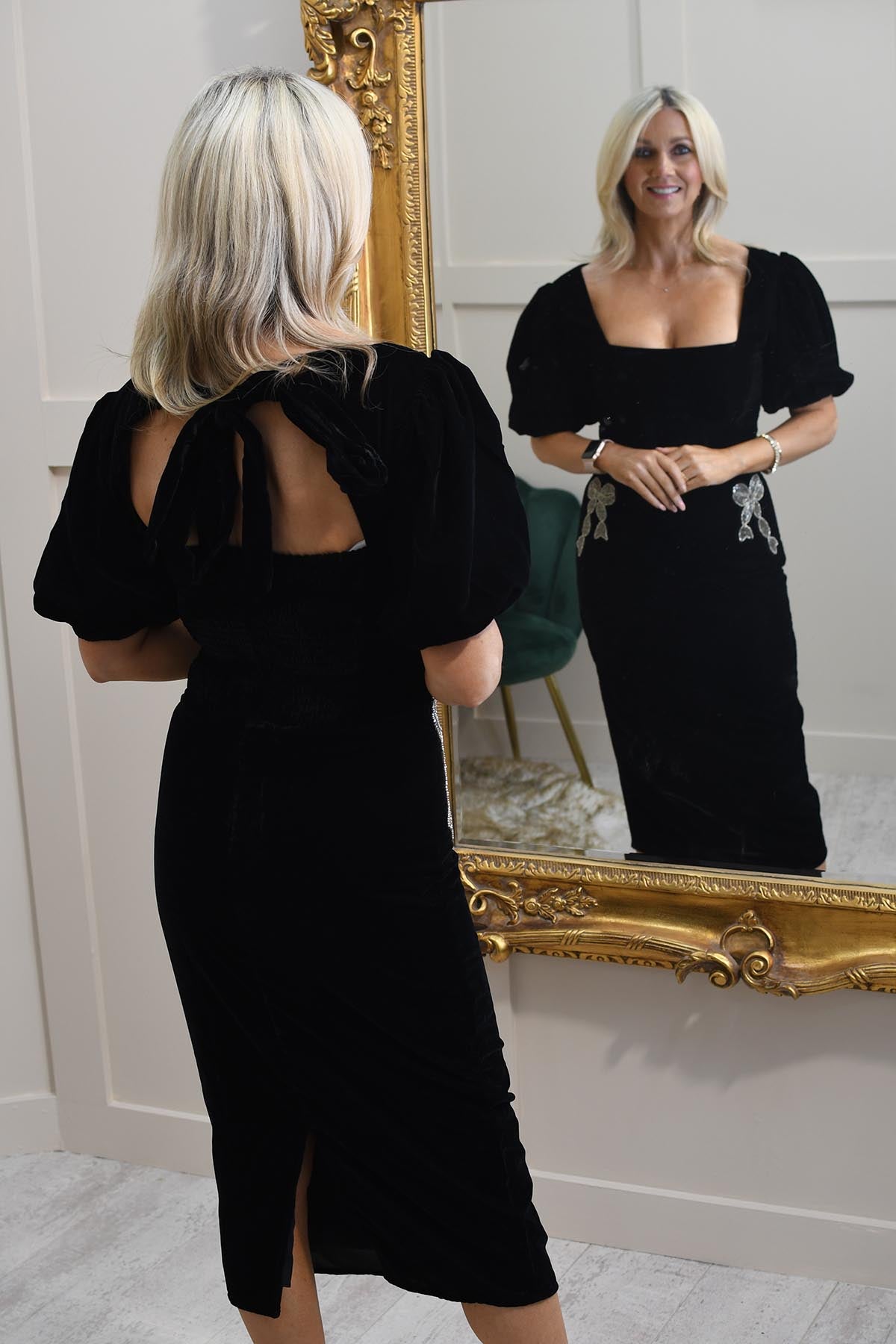 Hope & Ivy Puff Sleeve Midi Dress With Embellished Bow Details- Alba
