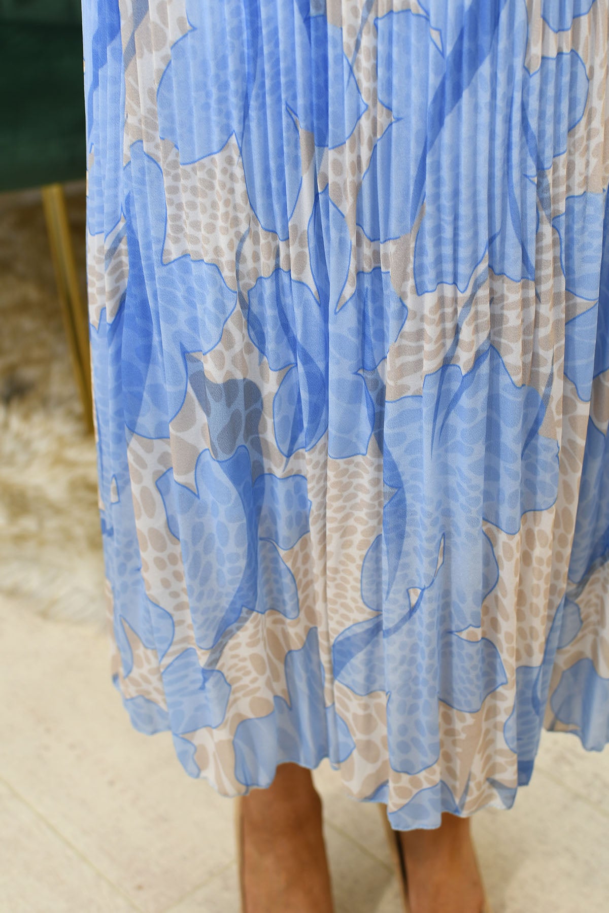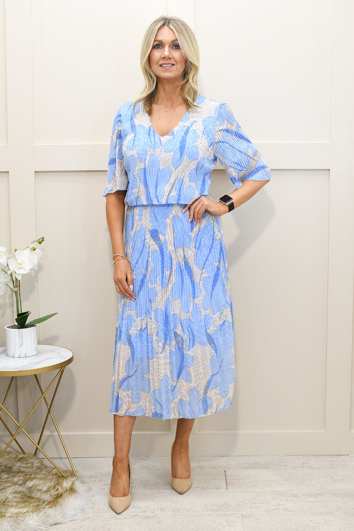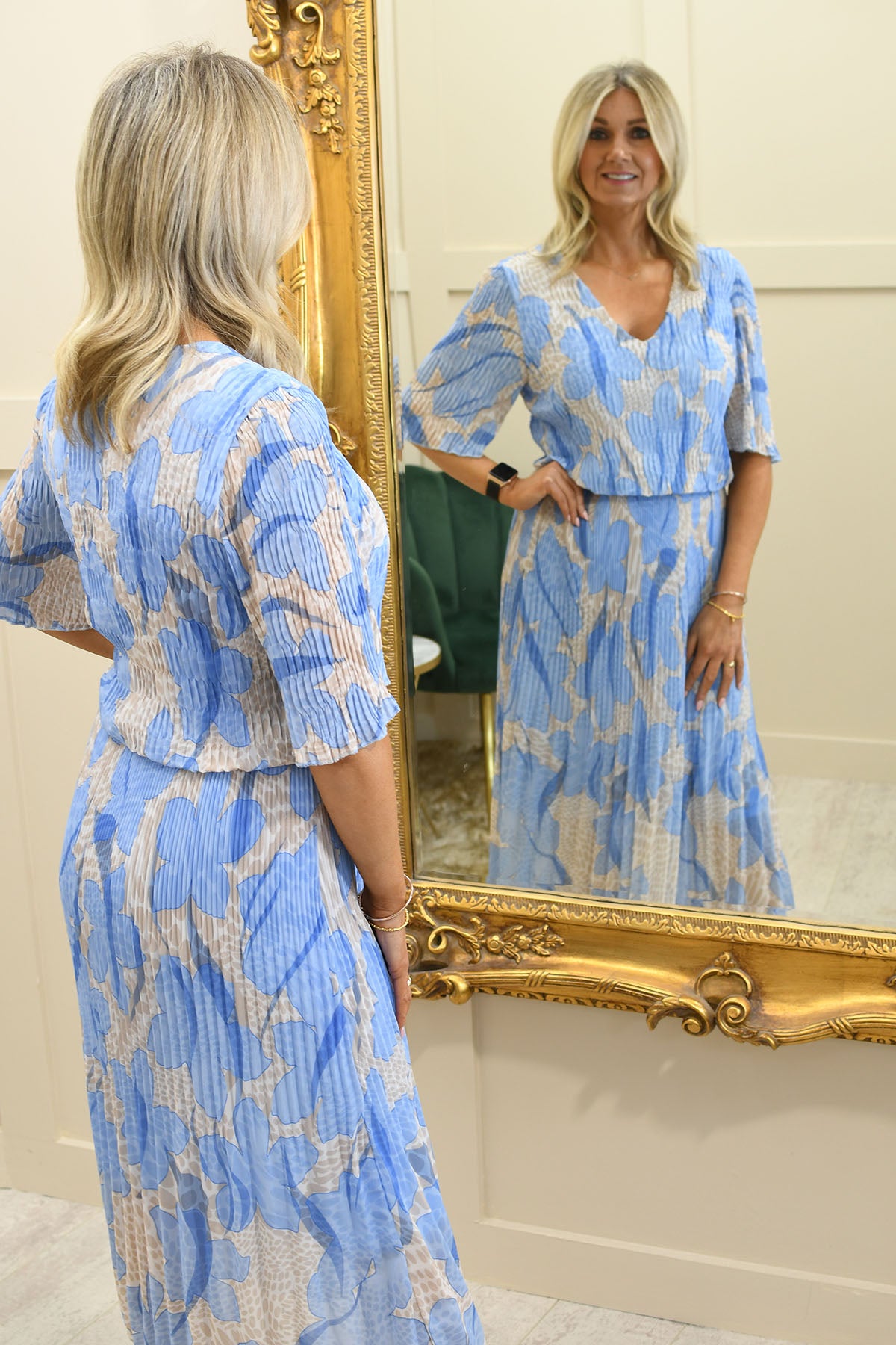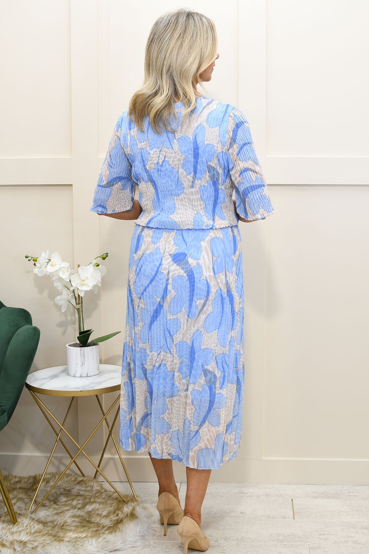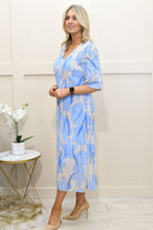 Step into effortless elegance with this dusty blue floral print plissé dress crafted from a soft blend of 95% viscose and 5% elastane, offering breathable comfort with gentle stretch. Designed with a flattering silhouette, the plissé texture adds beautiful movement and dimension while enhancing the overall drape. The delicate floral print brings a timeless, feminine touch, perfect for elevating your occasionwear. Lightweight and easy to wear, this dress is ideal for weddings, garden parties, or smart-casual events. Perfect for those searching for floral dresses, plissé styles, or comfortable stretch fabrics with graceful, flowing appeal.
