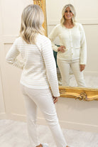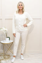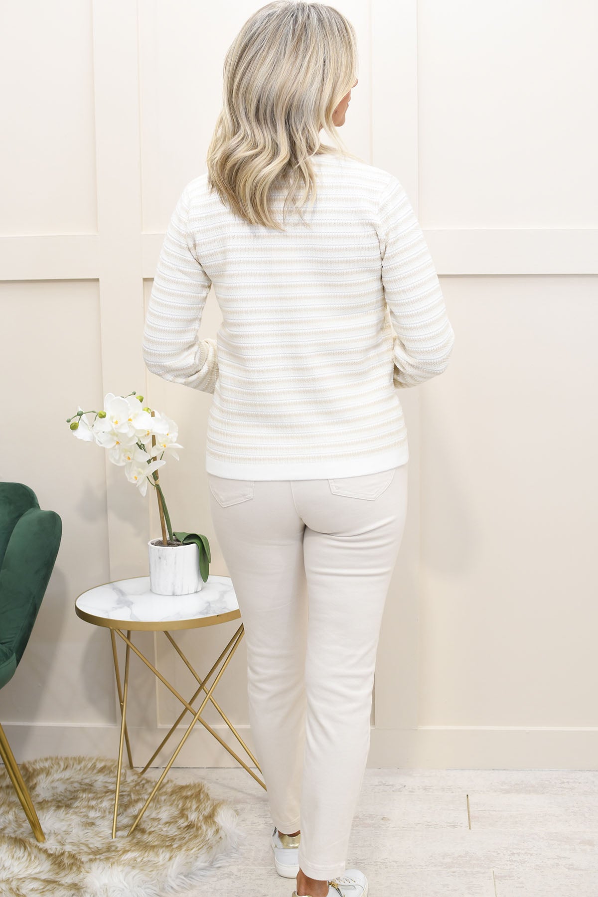 Add effortless elegance to your knitwear collection with this beige and cream striped cardigan, designed to combine timeless pattern with refined embellishment. Crafted from a soft, lightweight blend of 75% viscose and 25% polyester, it offers a smooth feel with beautiful drape and comfortable wear throughout the day. The classic stripe design is elevated with delicate beaded detailing, adding a subtle touch of sparkle and sophistication. Perfect for layering over tops or dresses, this versatile cardigan pairs effortlessly with denim or tailored trousers. Ideal for smart-casual occasions, lunches, or polished everyday styling, it delivers comfort with a graceful, feminine finish.