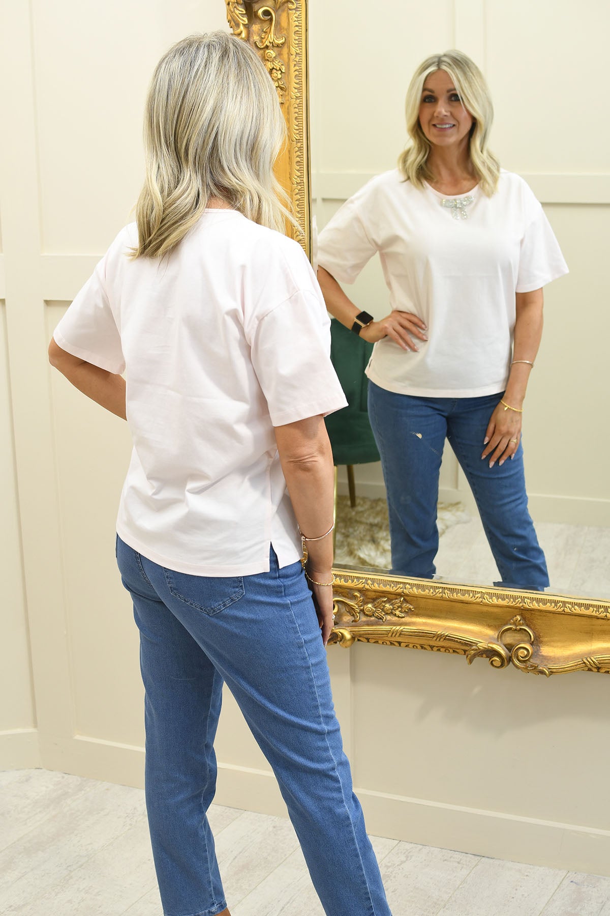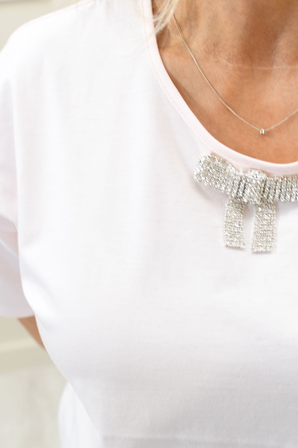 Add soft femininity and refined detail to your wardrobe with this light pink top, designed to elevate everyday dressing with a touch of elegance. Crafted from 100% cotton, it offers a breathable, comfortable feel that’s perfect for all-day wear. The delicate bow jewel detail creates a subtle focal point, adding a hint of sparkle and sophistication to the clean, classic silhouette. Easy to style with tailored trousers, skirts, or denim, this versatile top transitions effortlessly from day to evening. Perfect for smart-casual occasions, lunches, or polished daytime looks, it delivers timeless charm with effortless comfort.