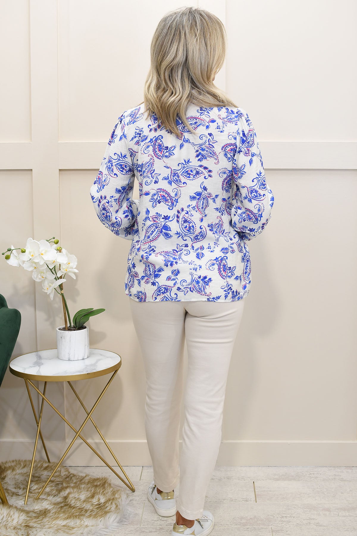 Add timeless elegance to your wardrobe with this blue paisley print blouse, designed to combine classic pattern with modern comfort. Crafted from a soft, lightweight blend of 81% viscose and 19% polyamide, it offers a breathable feel with a smooth drape that flatters the silhouette. The intricate paisley design brings a sophisticated, feminine touch, while the relaxed fit ensures effortless wear throughout the day. Versatile and stylish, this blouse pairs beautifully with jeans, tailored trousers, or skirts for both casual and smart-casual looks.