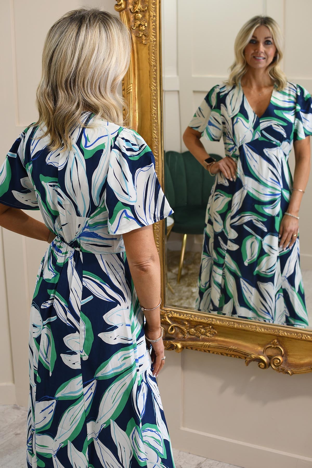 Step out in timeless style with the Pomodoro Navy, White & Green Darcy Tea Dress, a classic piece perfect for daytime events and casual gatherings. The elegant tea dress silhouette features a flattering fit-and-flare shape that enhances your figure, while the bold navy, white, and green print adds a fresh and contemporary touch. Crafted from lightweight, breathable fabric, it ensures comfort and effortless movement. The delicate neckline and gently cinched waist create a feminine finish, making it ideal for pairing with heels or sandals. Embrace effortless charm and sophistication with this versatile and stylish tea dress.