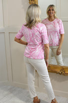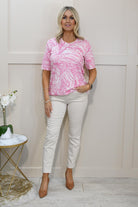 Introducing the Sunday Bubblegum Pink Print Pattern Top With Elasticated Waist, a vibrant addition to your wardrobe. Crafted from a soft blend of 95% viscose and 5% elastane, this top offers a comfortable fit with a gentle stretch, ensuring ease of movement throughout the day. The eye-catching bubblegum pink print adds a playful touch, while the elasticated waist creates a flattering blouson silhouette. Featuring a classic round neckline and short sleeves, this versatile top pairs effortlessly with jeans or skirts for both casual outings and dressed-up occasions. Ideal for those seeking stylish and comfortable women's tops.
