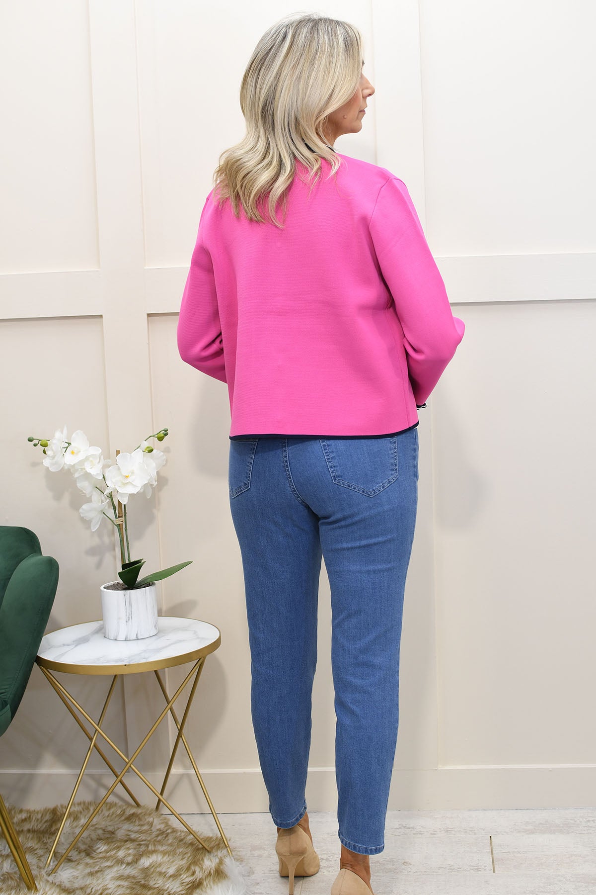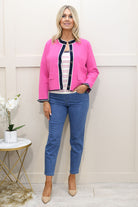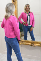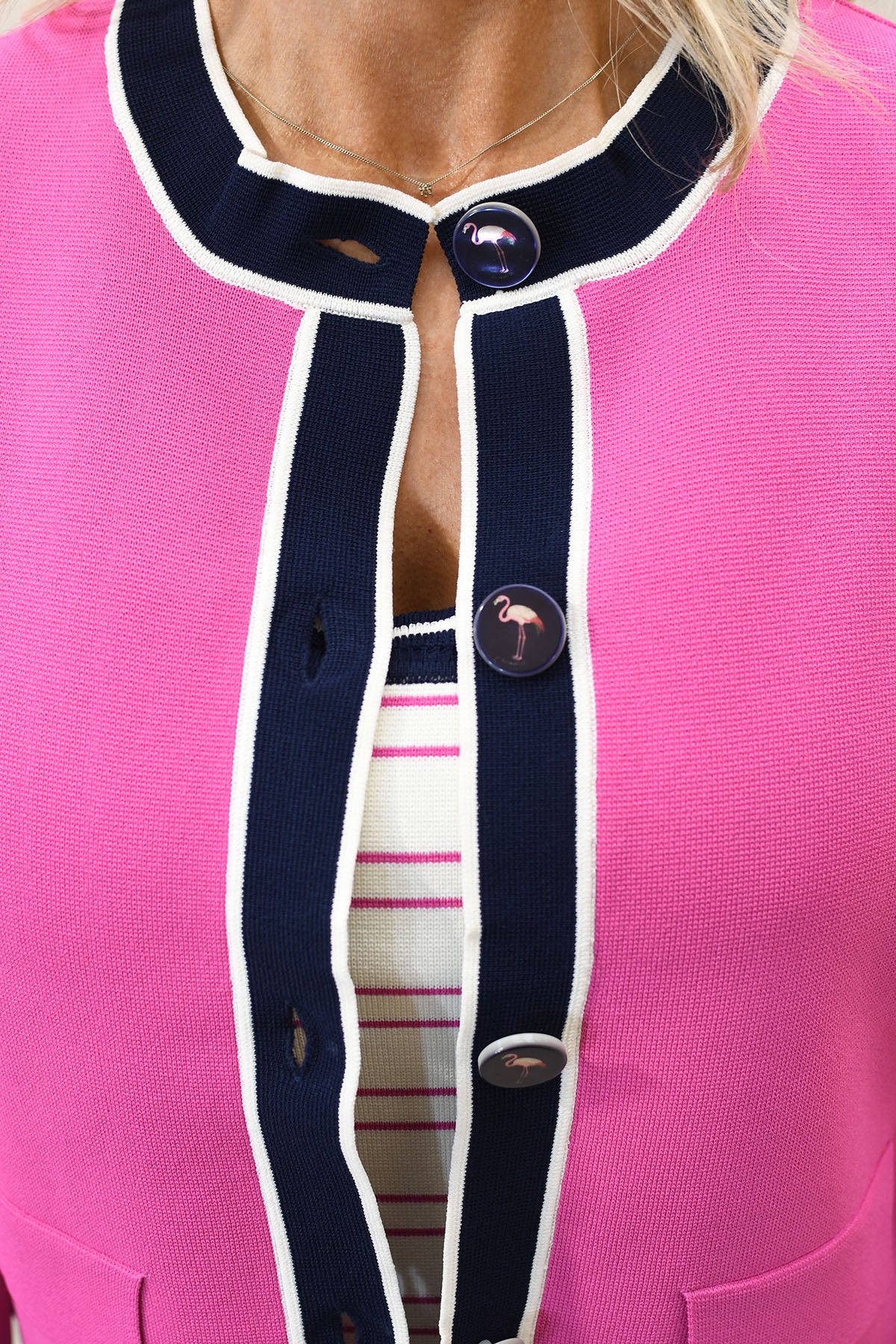 Add a playful statement to your wardrobe with this fuchsia flamingo cardigan crafted from a soft blend of 65% viscose and 35% nylon, offering lightweight comfort with a smooth, breathable feel. Designed with a flattering fit, it features a charming flamingo motif that brings a fun, distinctive touch to your everyday style. The lightweight knit makes it perfect for layering across seasons, whether worn over casual outfits or paired with smarter looks. Easy to style and effortlessly eye-catching, this piece is ideal for those searching for statement cardigans, colourful knitwear, or unique layering pieces with personality.