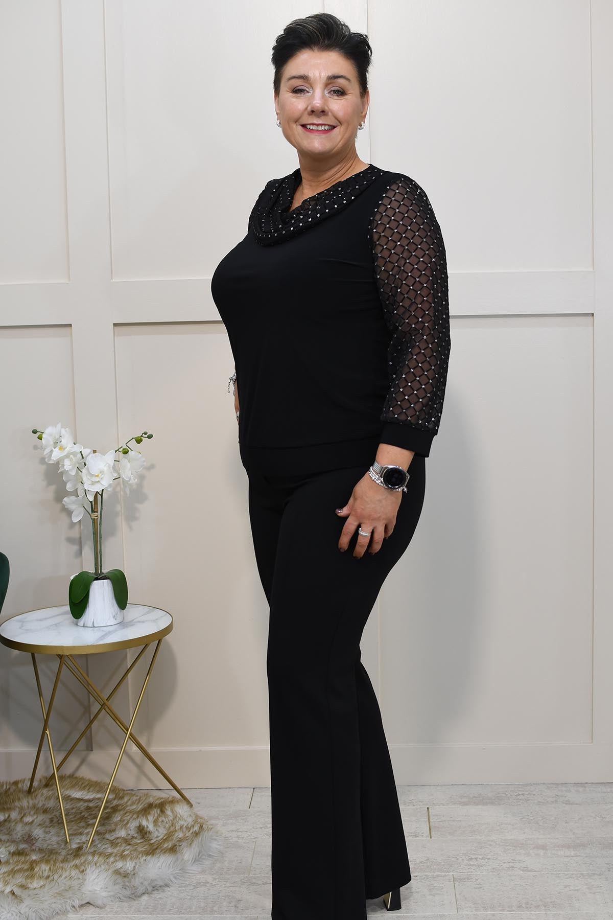 Elevate your evening look with the YEW Black Cowl Neck Top. This chic top features a sophisticated cowl neckline, creating a flattering drape that exudes effortless elegance. The standout detail is the sheer, sparkle-embellished sleeves that add a touch of glamour, while still maintaining a subtle, refined look. Crafted in a versatile black, this top pairs beautifully with tailored pants or a sleek skirt, making it a perfect choice for special occasions or a night out. Embrace understated sparkle and timeless style with this captivating piece.