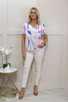 The YEW Nude, Pink & Blue V Neck Short Sleeve Top is a graceful fusion of soft tones and effortless style. Featuring a subtle blend of nude, pink, and blue hues, this top offers a refreshing and contemporary look. The V-neckline flatters the neckline, while short sleeves and a relaxed silhouette provide comfort and ease. Ideal for both casual and semi-formal occasions, the Delilah 4153 pairs seamlessly with denim, skirts, or tailored bottoms. With its feminine palette and versatile design, this top brings a touch of quiet elegance to your everyday wardrobe.