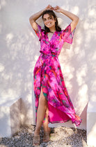 Hope & Ivy Pink Floral Flutter Sleeve Maxi Wrap Dress with Tie Waist- Corinne