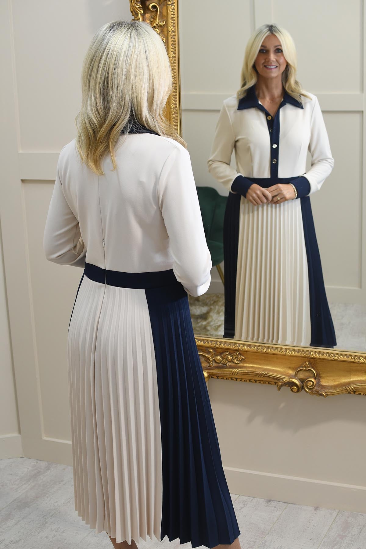 The Arggido Cream & Navy Pleated Shirt Dress is a chic and versatile piece that blends classic style with modern elegance. Featuring a sophisticated cream and navy colour palette, this shirt dress is designed with pleated detailing that adds movement and a touch of femininity to the silhouette. The tailored shirt-style top with a collared neckline and button-down front offers a polished, structured look, while the flowing pleats create a soft and graceful finish. Perfect for both workwear and casual outings, this dress is a timeless addition to your wardrobe, combining comfort and effortless style.