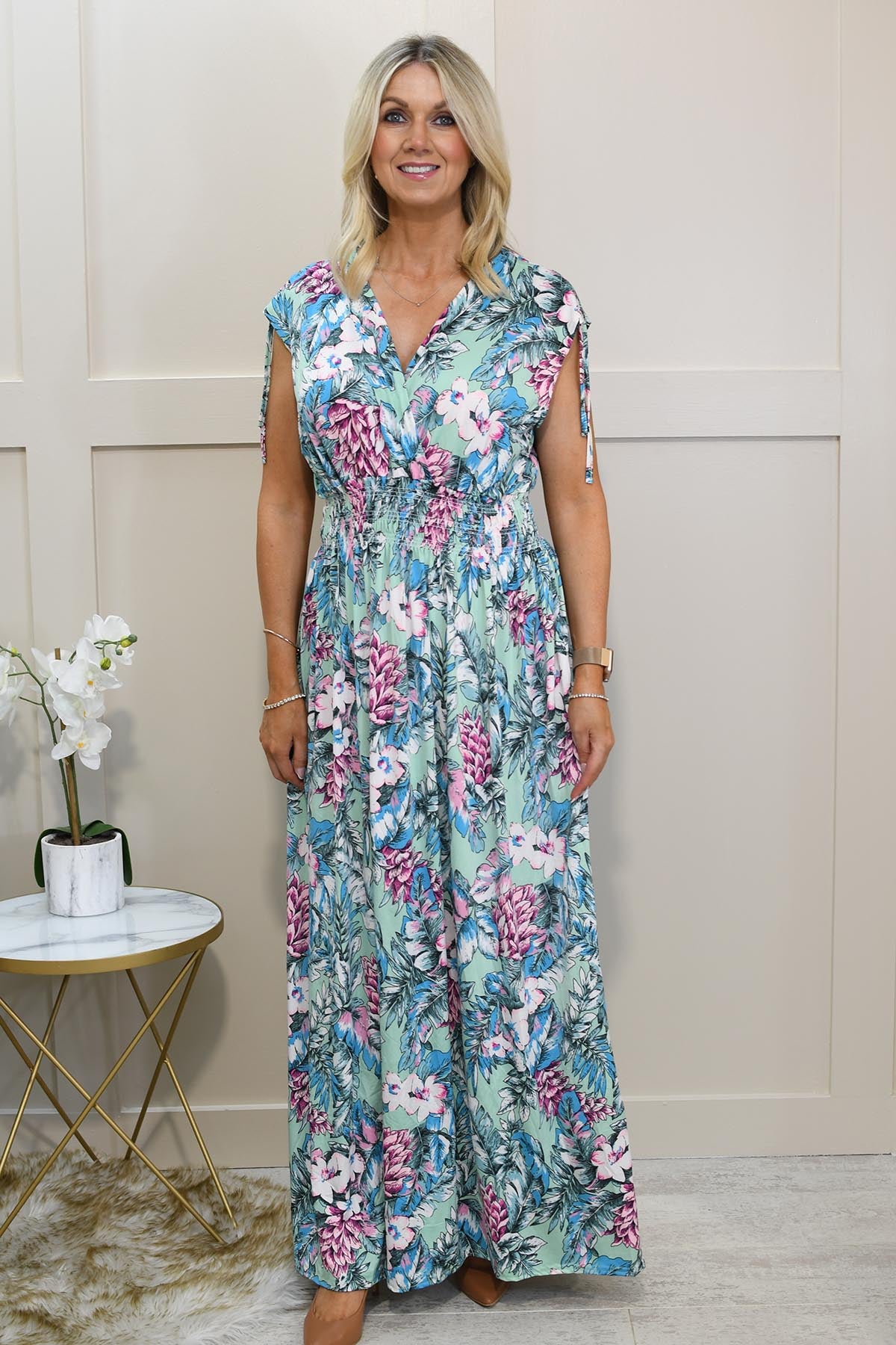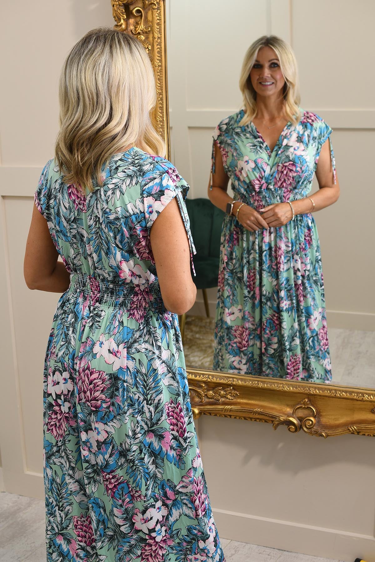 Elena Z Sage & Pink Floral Magic Fit Maxi Dress With Ruched Shoulder Detail-023-53