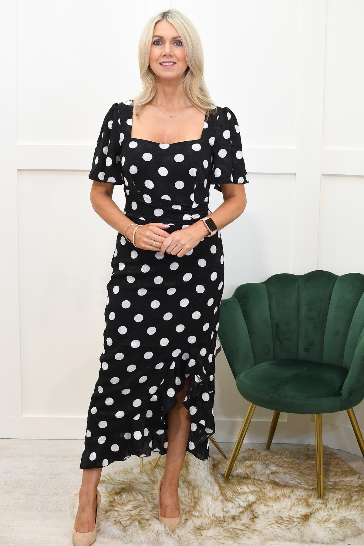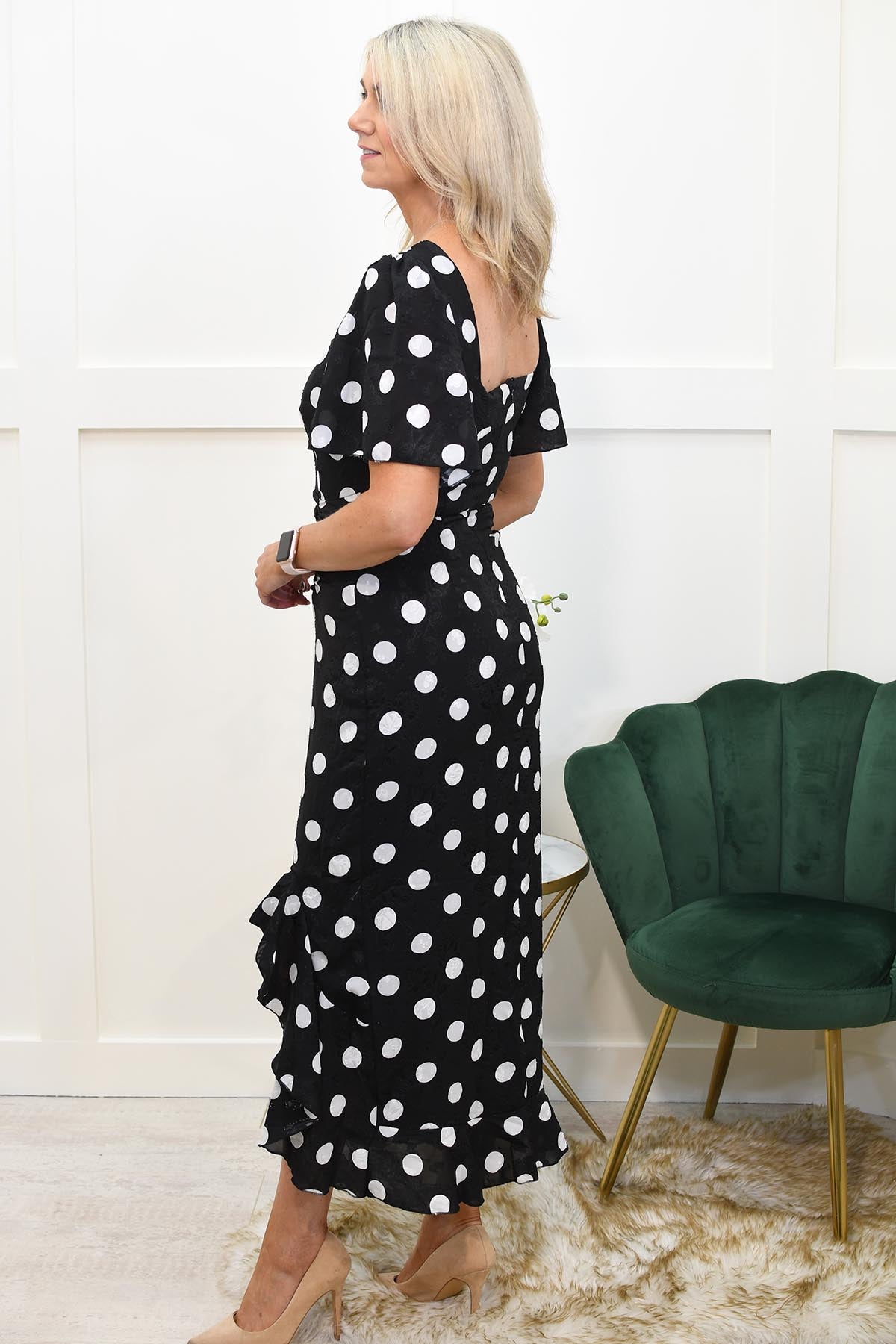 Step into elegance with the "Heidi" Black & White Spot Burnout Ruched Midi Dress from Girl In Mind. This exquisite dress features a captivating black and white spot burnout pattern that exudes sophistication and charm. The ruched detailing along the bodice beautifully accentuates your curves, creating a flattering silhouette. Designed with a midi length, this dress offers a perfect blend of timeless style and modern chic.