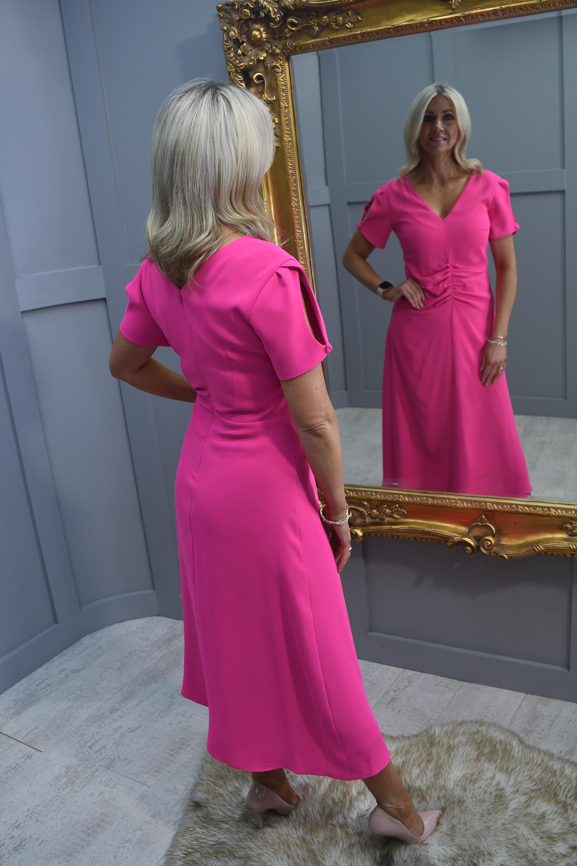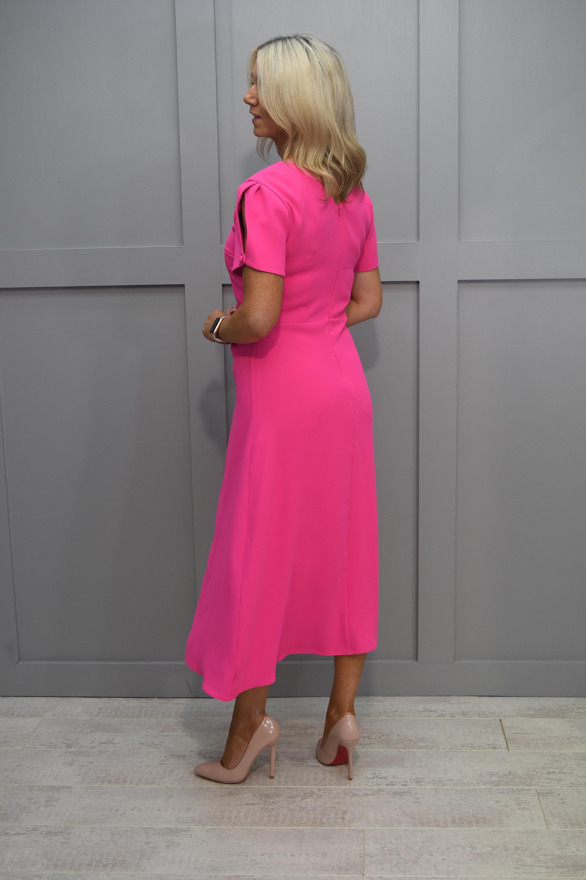 Kate Cooper Hot Pink V Neck Dress With Gathered Waist Detail Description