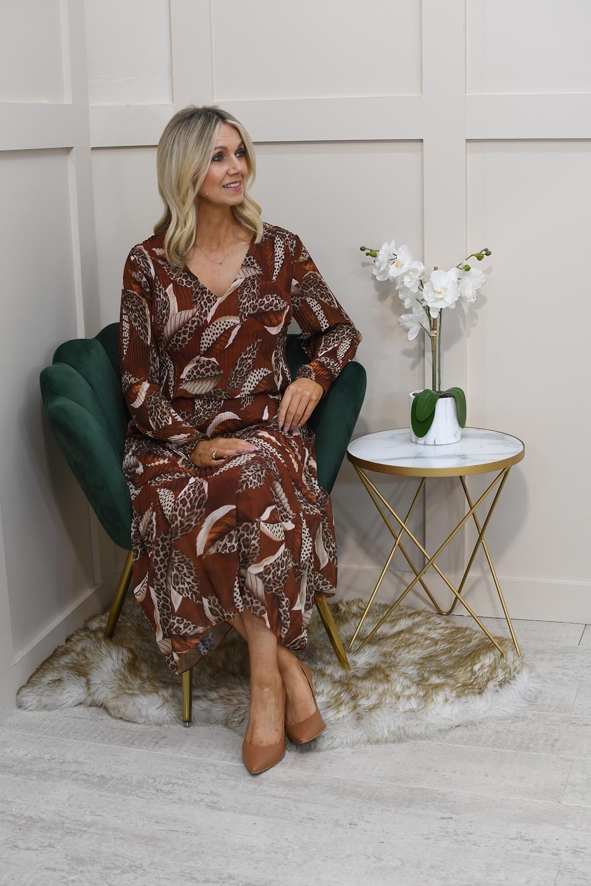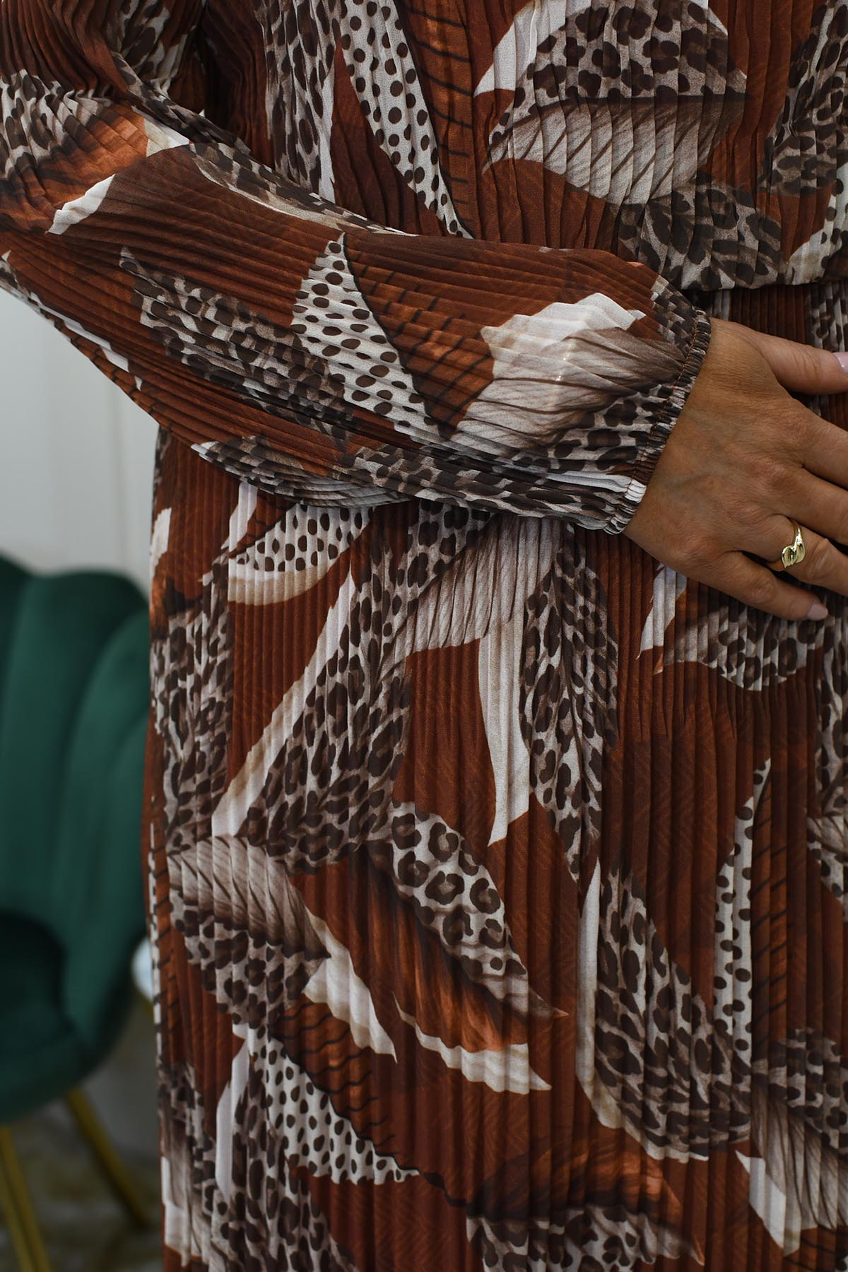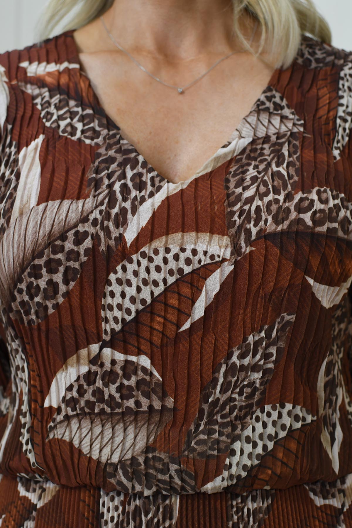 Kyla Animal Leaf Print Plisse Dress- Rust 6809