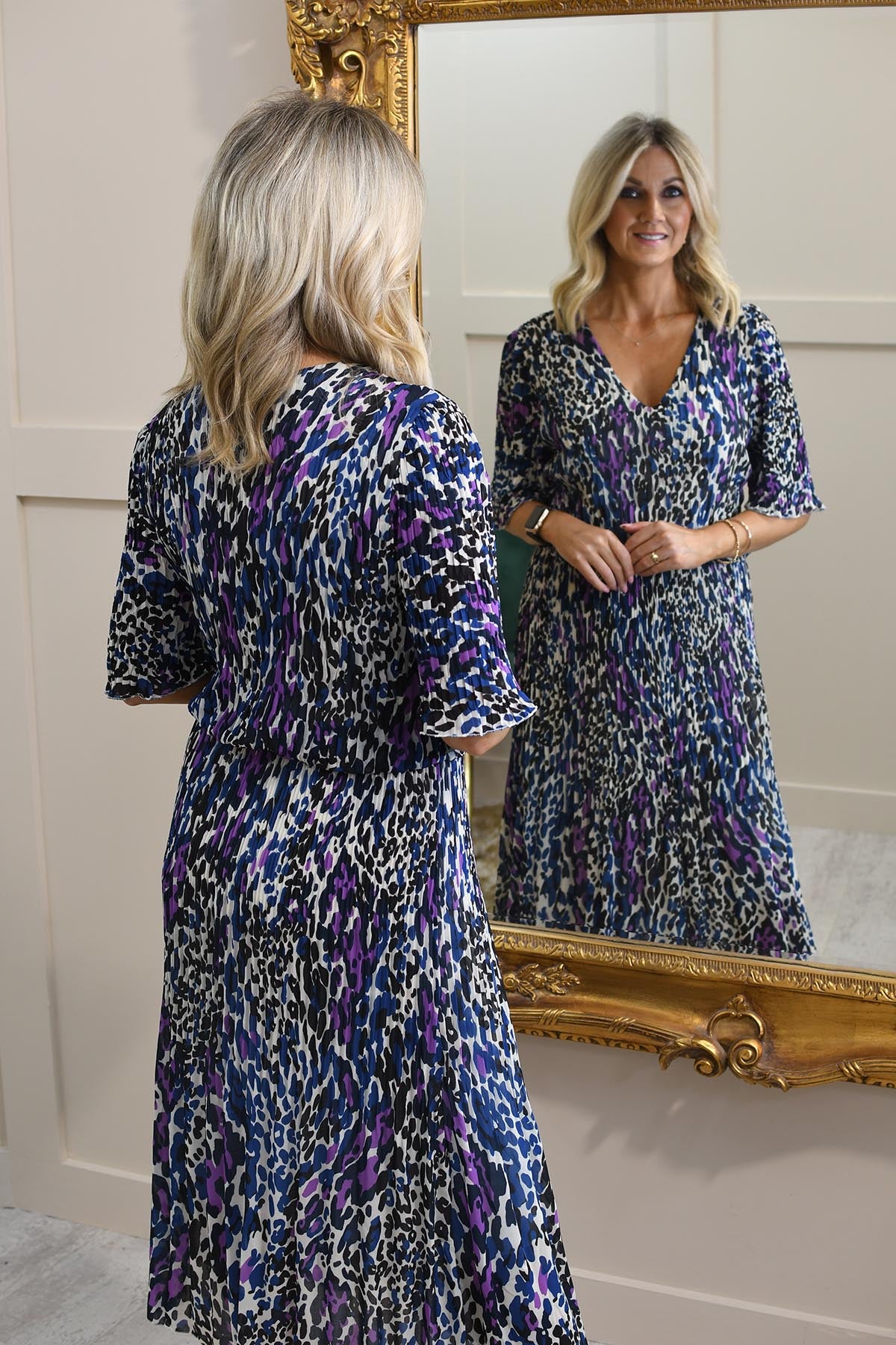 Make a bold statement with the Kyla Midnight Blue & Purple Animal Print Plisse Dress, a sultry fusion of colour, texture, and effortless elegance. Crafted from a comfortable blend of 95% polyester and 5% elastane, this dress offers a flattering, flexible fit that moves with you. The striking animal print in rich tones brings a contemporary twist to a classic silhouette, while the pleated plissé fabric adds a touch of texture and sophistication. Lightweight and easy to wear, it’s perfect for both daytime events and evening occasions. A go-to dress for standout style with minimal effort.