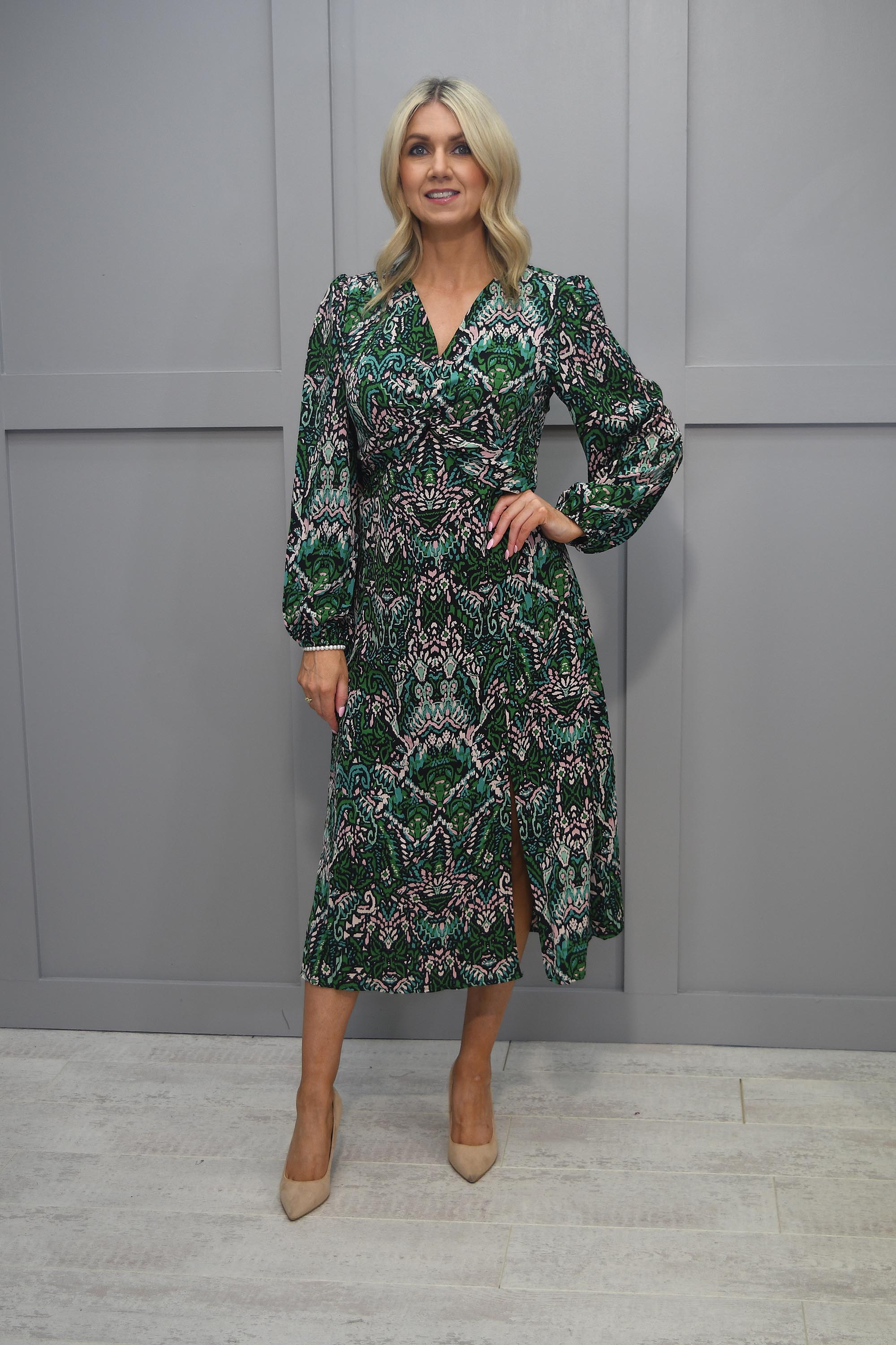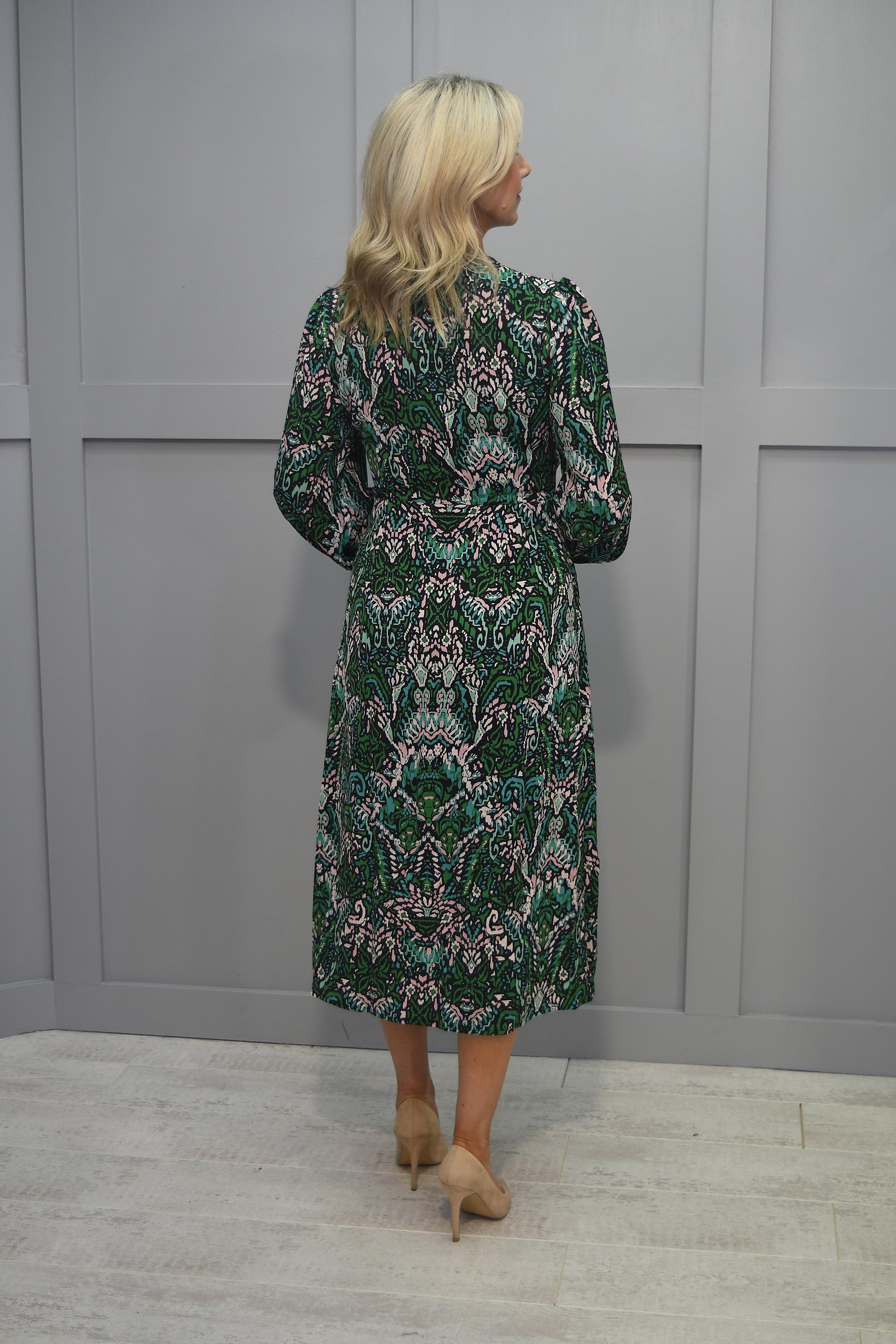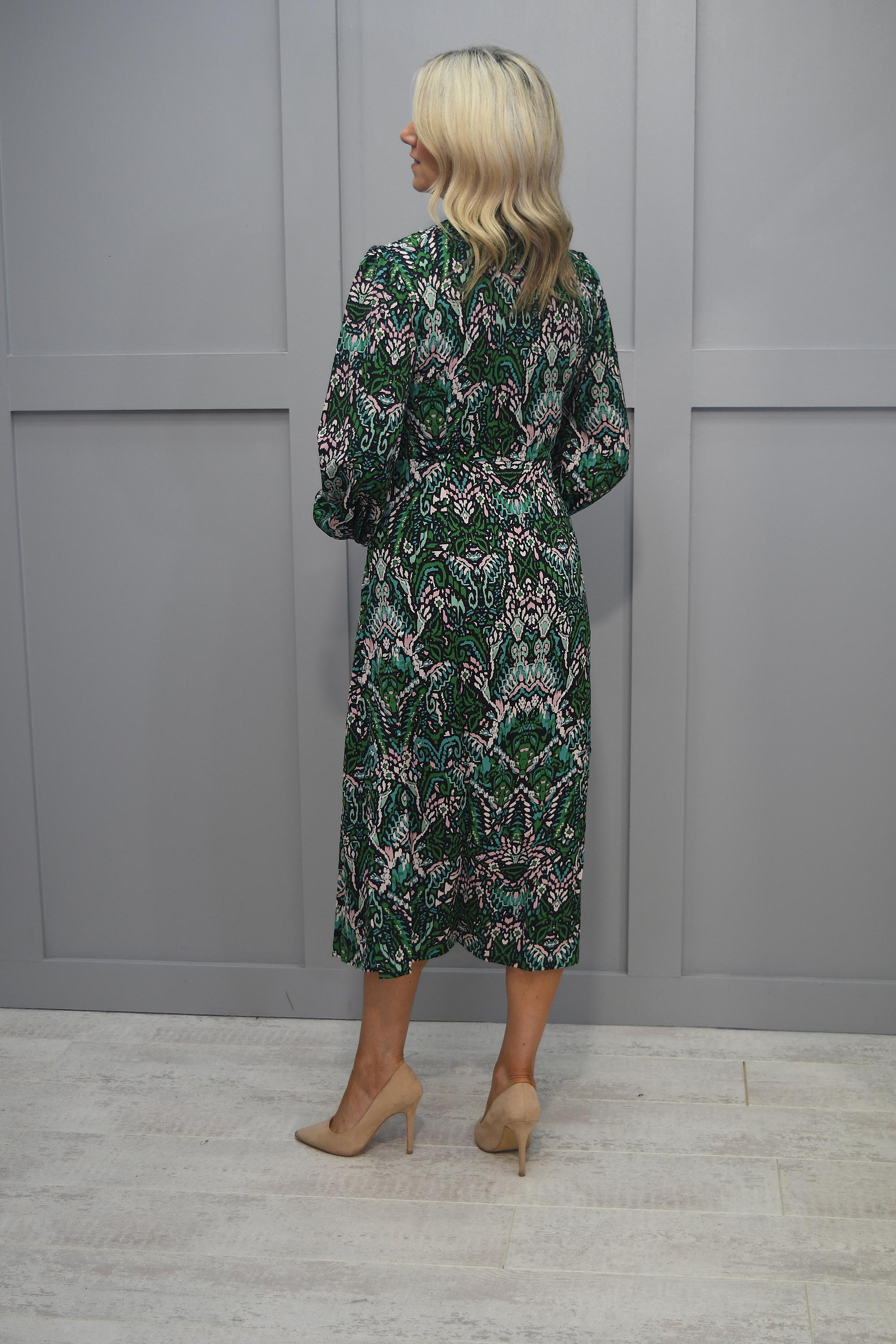 This dress is a symphony of colors that effortlessly complements one another. The lush green, classic black, and delicate blush hues intertwine seamlessly, forming a visually captivating palette that radiates sophistication and style.