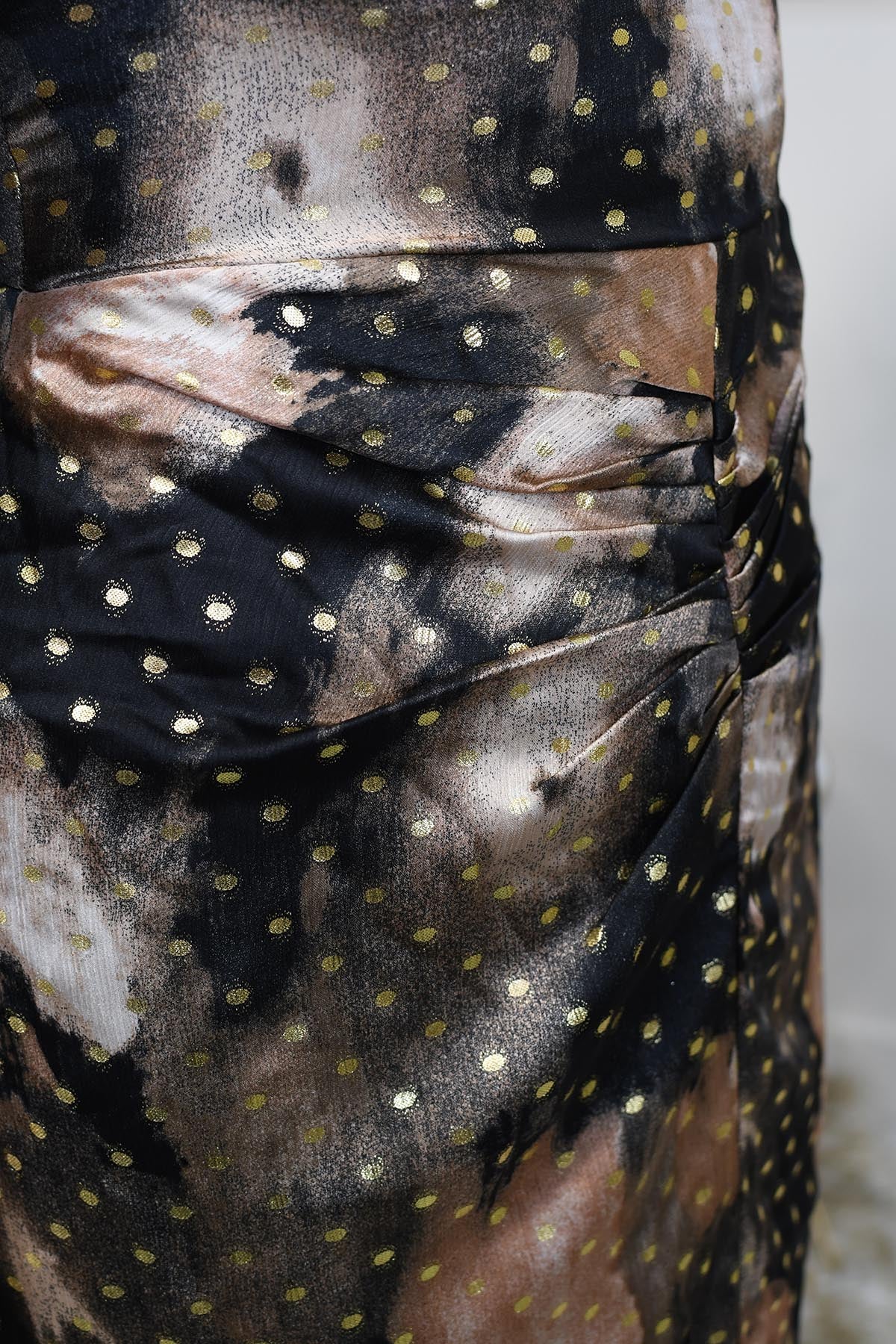 Girl In Mind Ruched Detail Midi Dress With Gold Spot Print Description