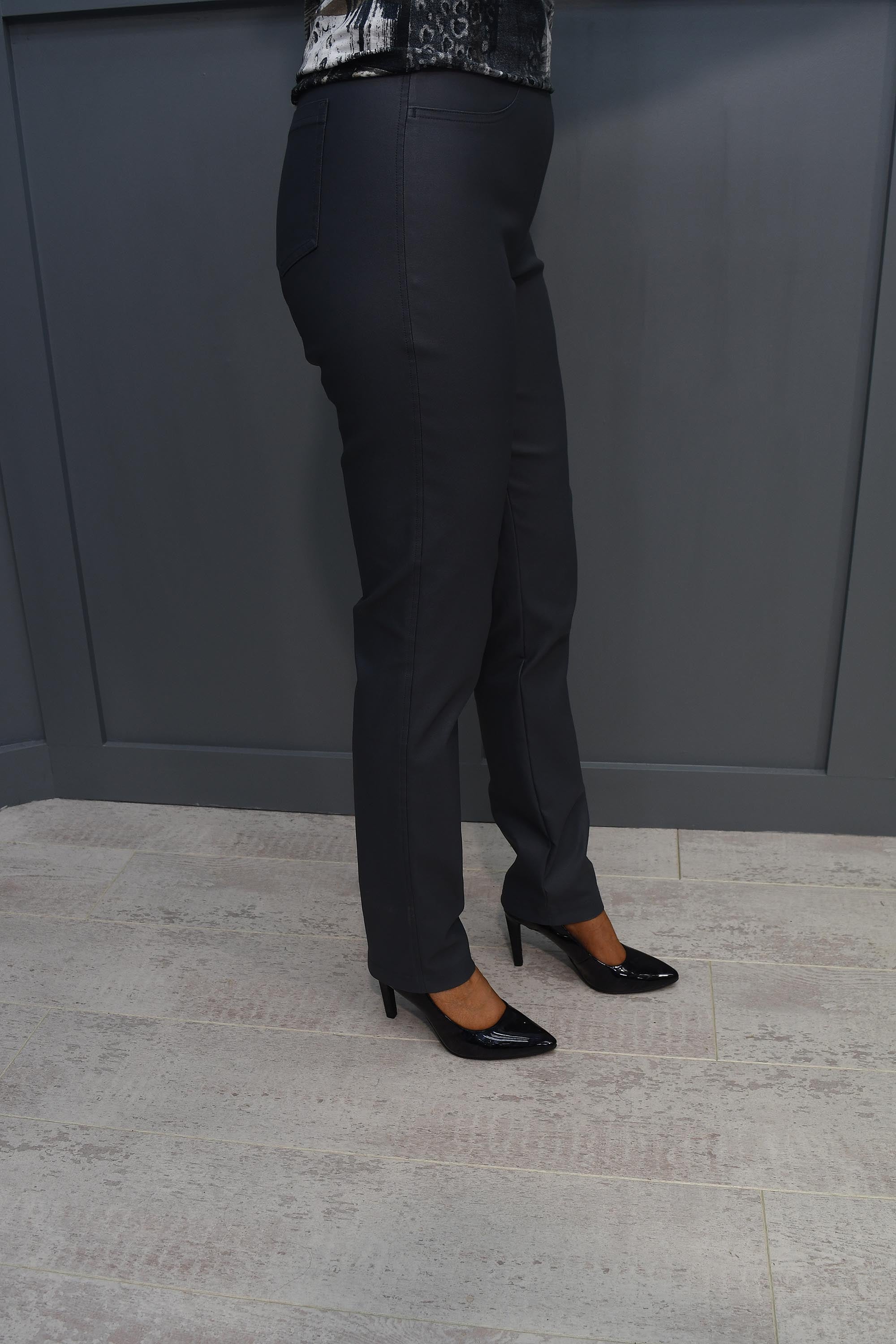 Here are some styling suggestions for the Bella Steel Grey Faux Leather Full-Length Trousers from Robell: