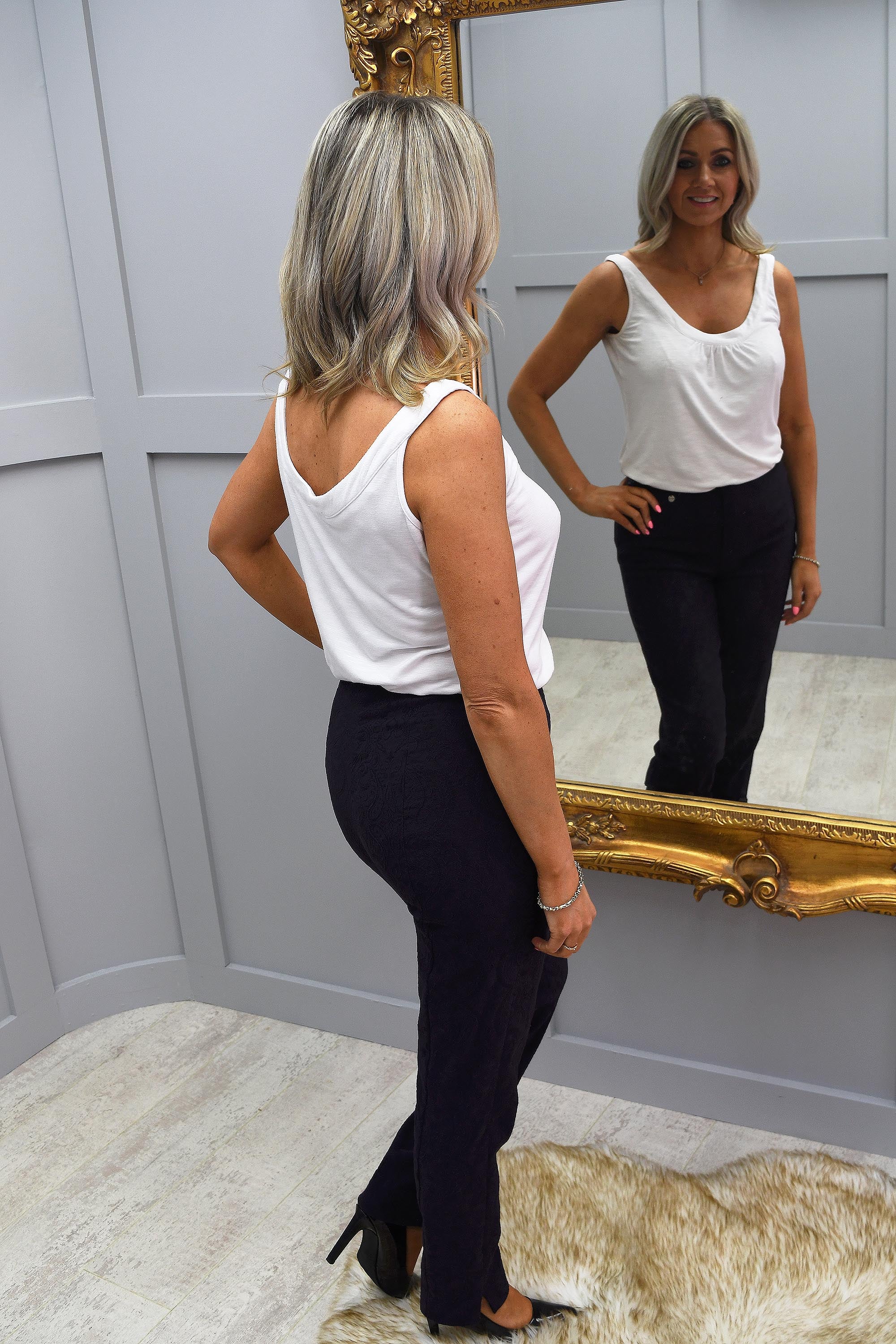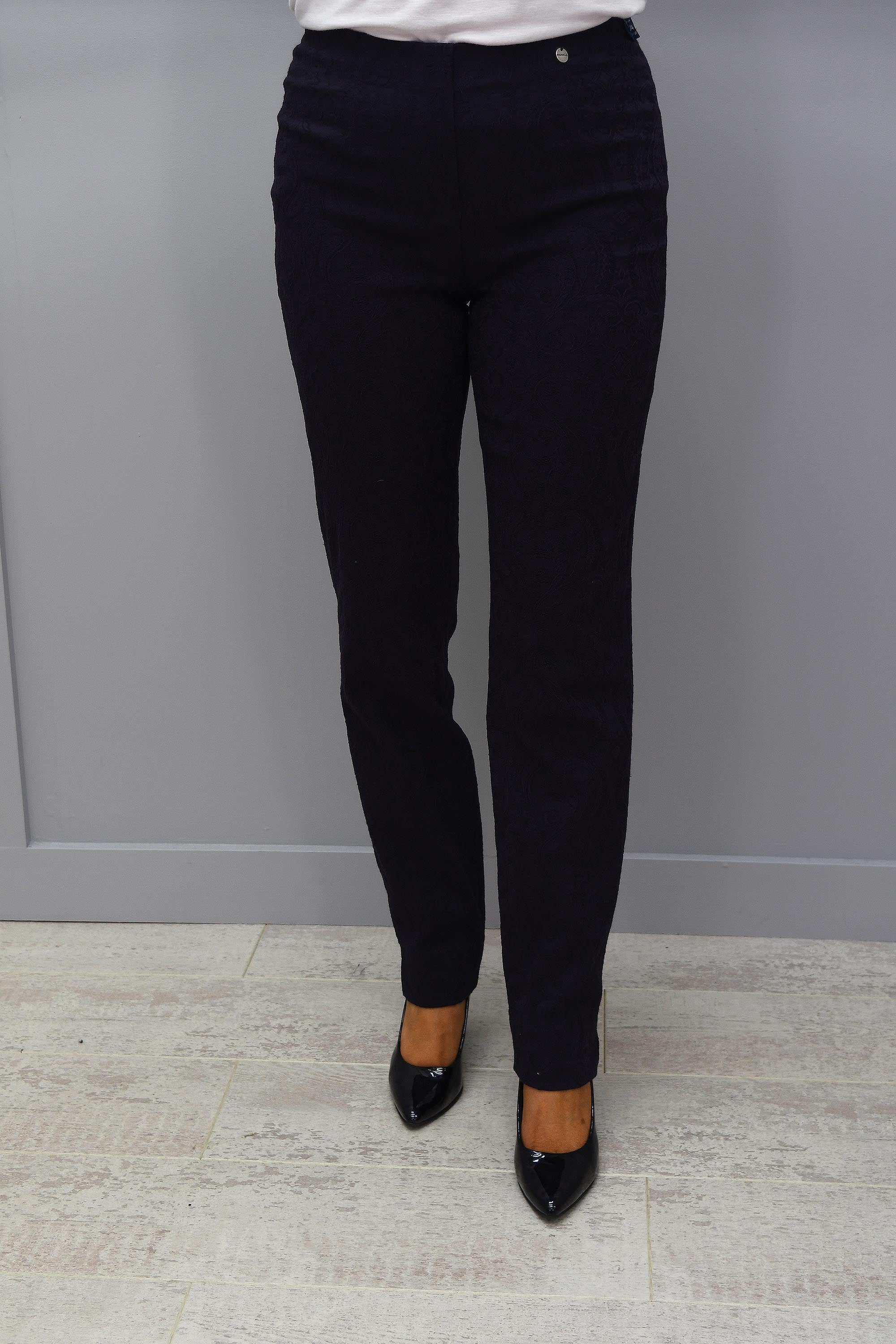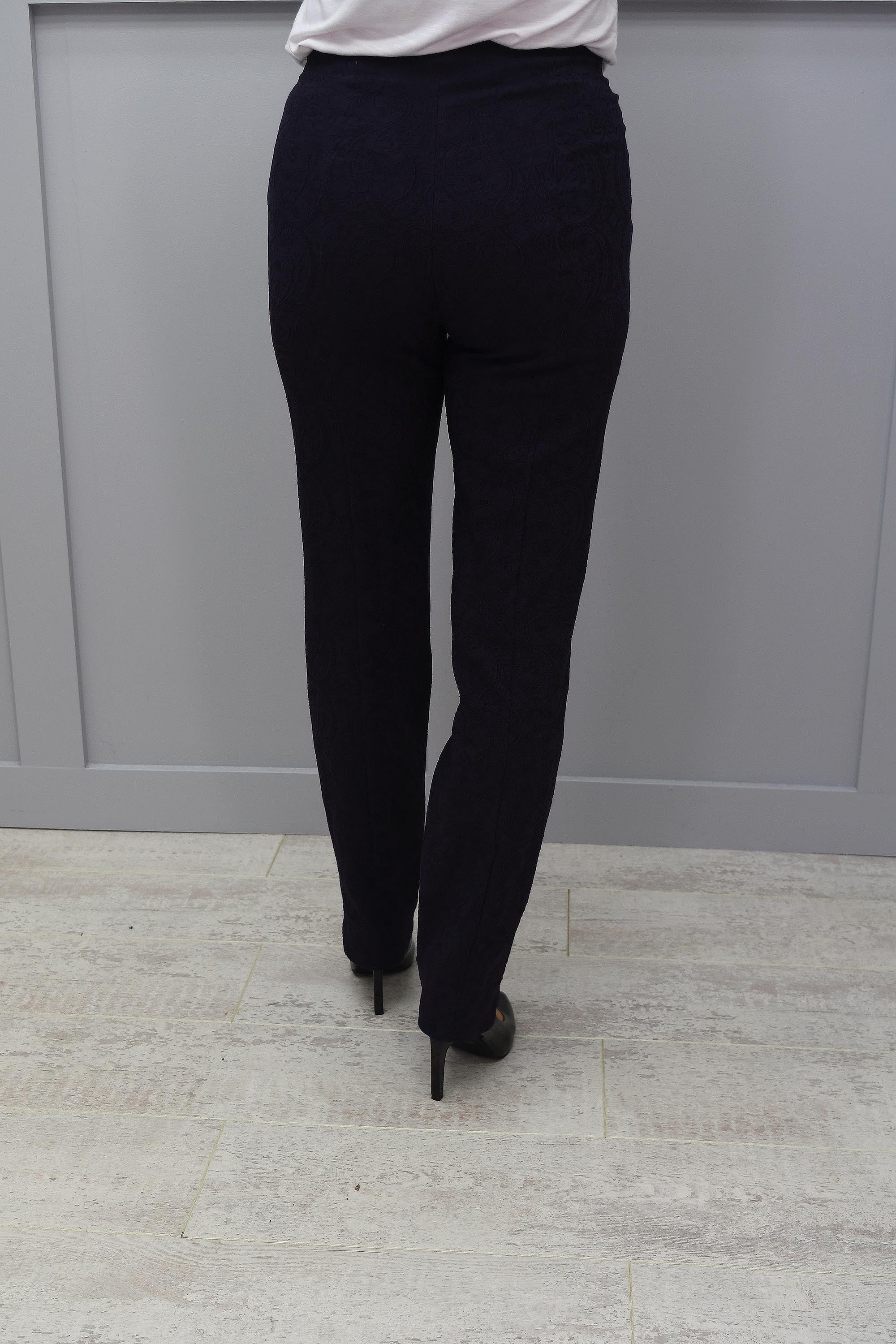 The Robell Marie Dark Purple Jacquard Trousers are a definite cert for your wardrobe all year round. The bold purple colour combined with that textured swirl print throughout these trousers, create a truly remarkable little number. A particular favourite with all our customers, the Robell Marie Jacquard Trousers have an incredibly comfy pull on design. A clever seam and a flat elasticated waist band allows these trousers to accentuate your shape. With a straight fit and splits at either side of the ankle, they are the perfect addition to any look you want to create. If you want a dressy look for work, then wear a white shirt and a pair of heels and you'll be a style staple in seconds. Perfect for everyday wear with a pair of flats and a comfy top. Don't keep your look completely simple this season!