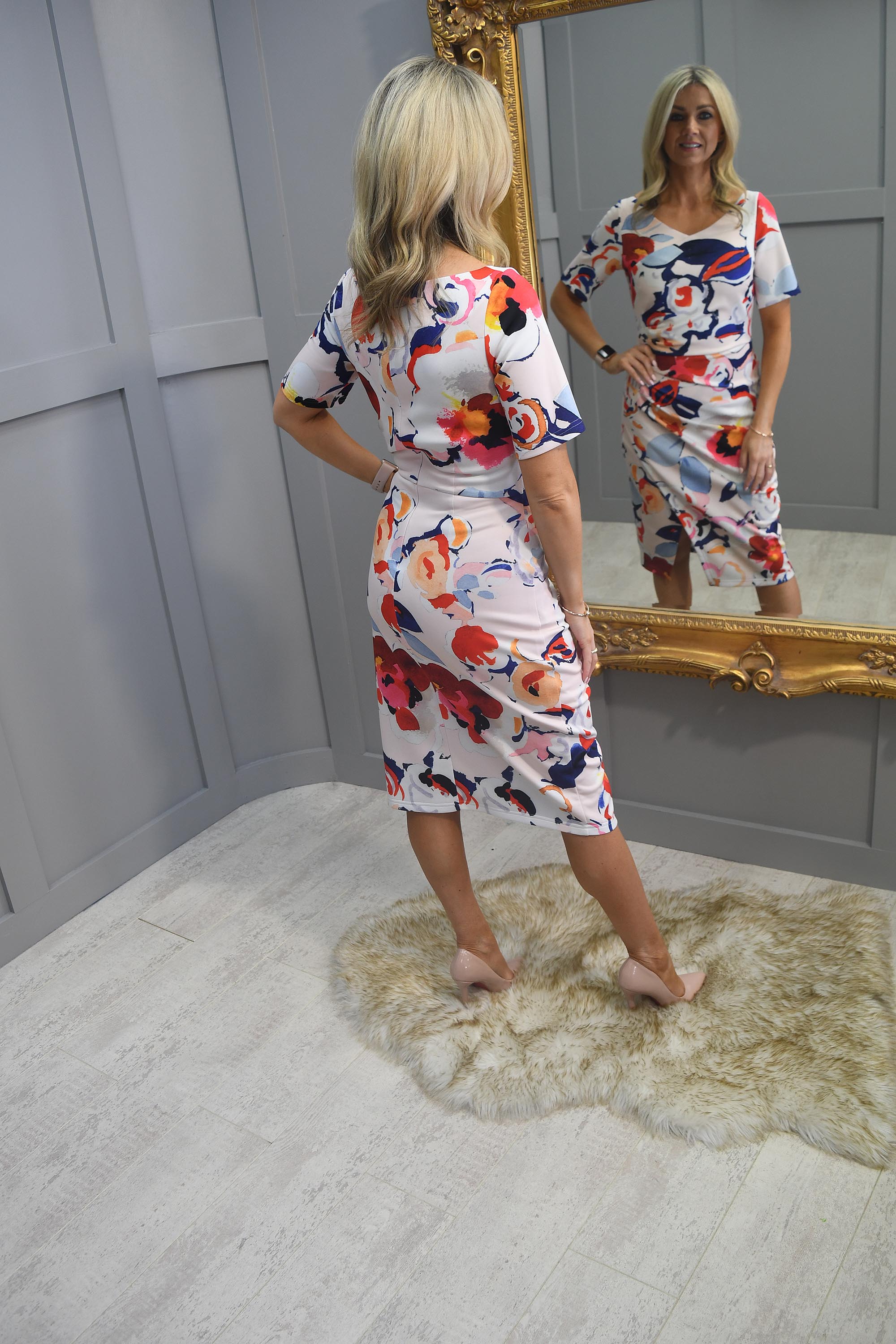 Tia Nude, Pink & Blue Floral Dress With Ruched Detail Description