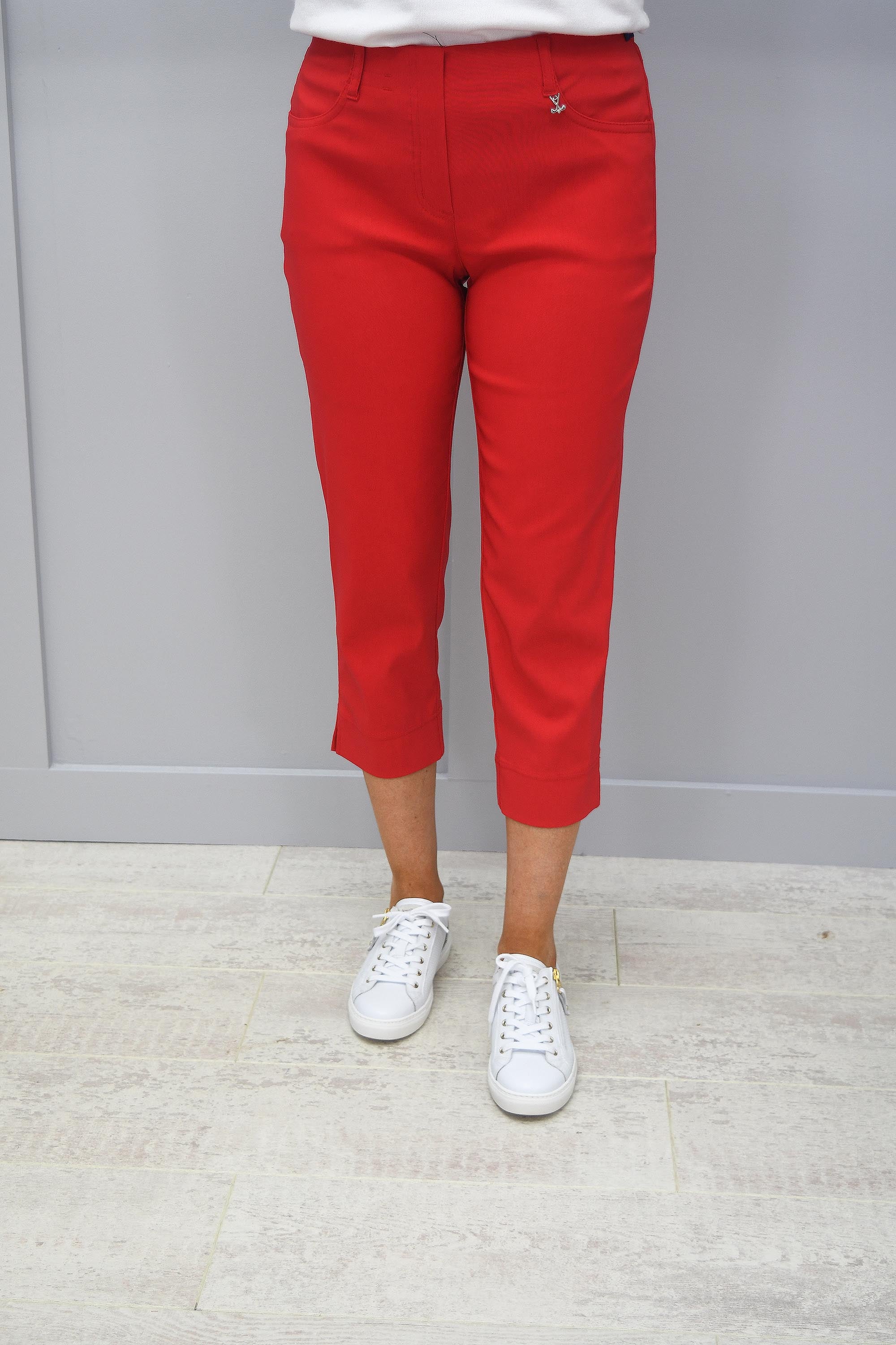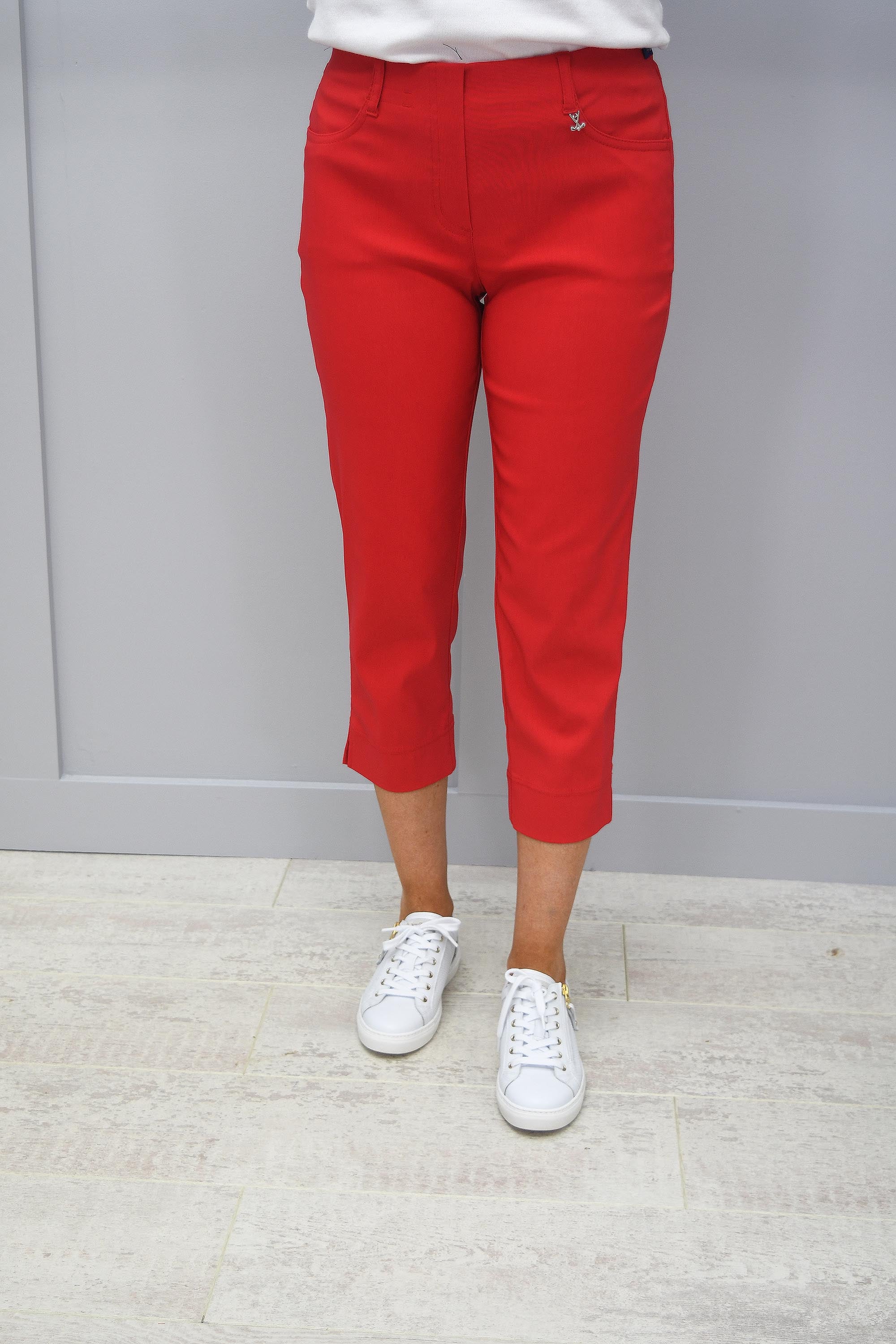 Be the most stylish woman on the golf course this season in our gorgeous Robell Red Lexi Golf Trousers! Showcasing the beautiful ¾ length leg, perfect for an all-day round of golf in the summer sun. Fully functional pockets on the front and back; ideal for storing your tees or markers and your golf gloves. From the golf course in the morning, to the clubroom in the afternoon…the Lexi trousers are entirely adaptable. Premium quality and design, perfectly fitting for a lady of leisure. An extremely comfortable pull on design with a flattering fit, these Robell Red Lexi Trousers will be your new essential item for showing off your skills and your style. The decorative golf club pendant attached to the waistband transform these shorts from stylish to superior. If you're not a golfer but you want the perfect pair of dressy trousers for your sun holiday to wear out at night...then these Lexi trousers will tick all the boxes.