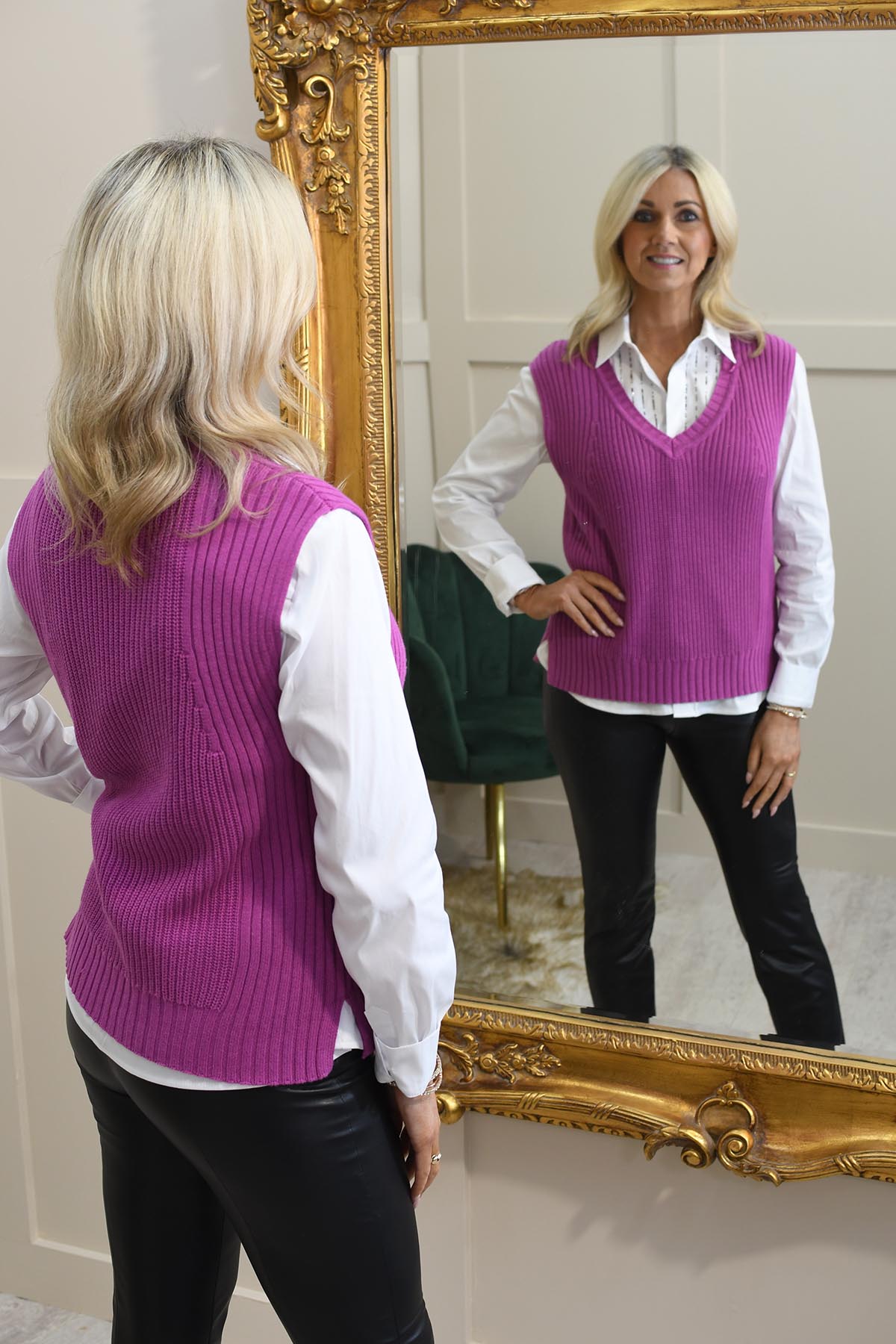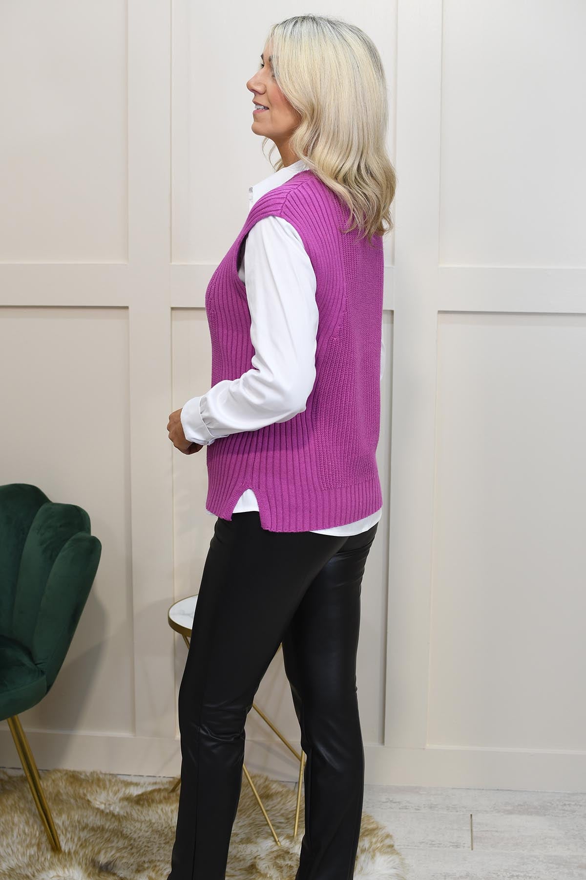 Add a vibrant touch to your layering essentials with the Marble Berry Knit Sweater Vest. This stylish sweater vest, crafted in a rich berry hue, brings a pop of colour to any outfit while exuding sophistication and charm. The knit texture provides a cozy and warm feel, making it an ideal choice for transitional weather and versatile layering.