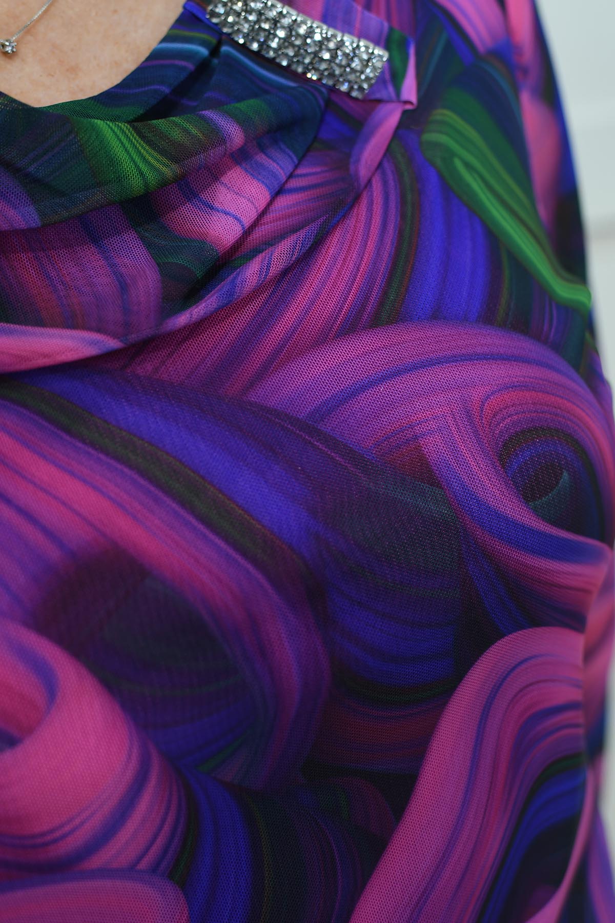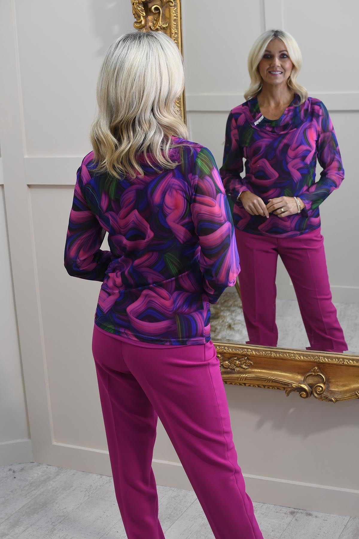 Via Veneto Cherry Pink, Blue & Green Swirl Cowl Neck Top With Brooch- V211