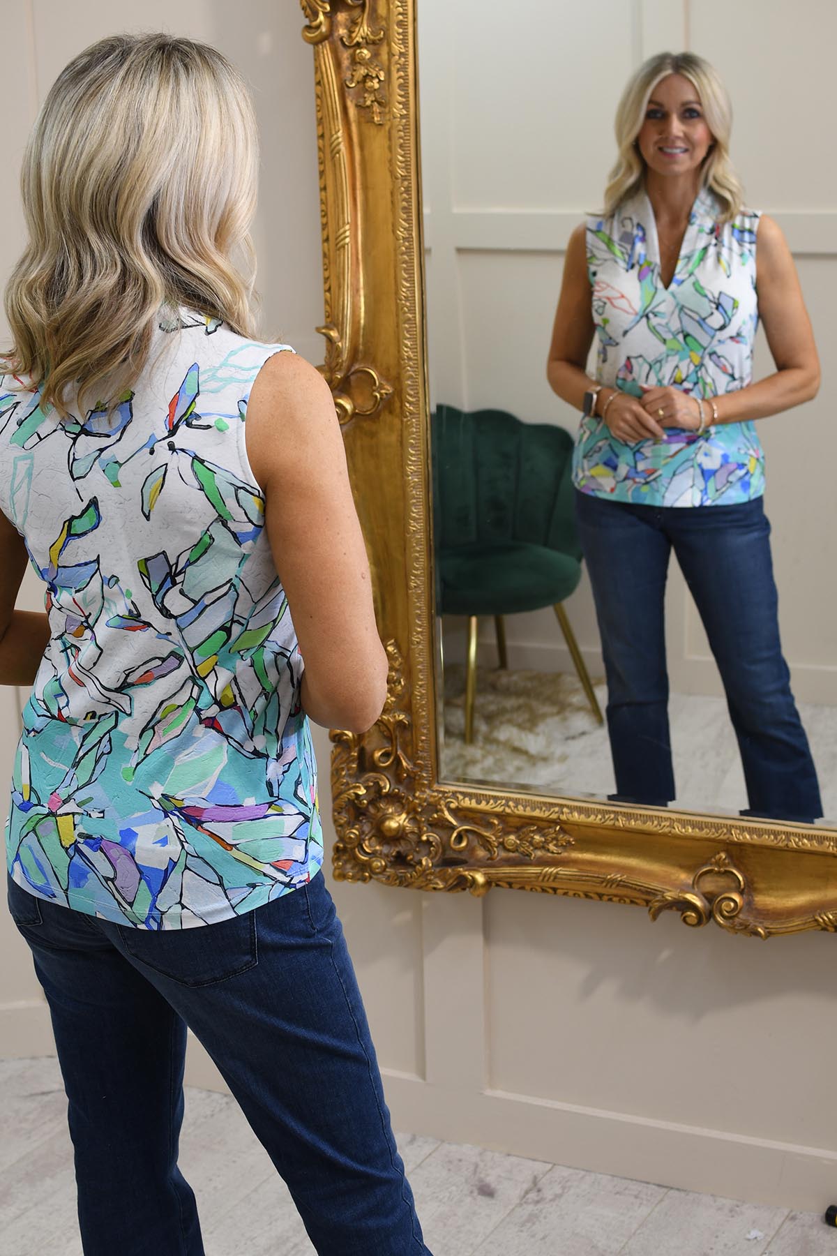 Elevate your summer wardrobe with the Dolcezza Multicolour Abstract Print V Neck Sleeveless Blouse from the Half Moon Rising Collection. This eye-catching blouse features a vibrant abstract print that adds a splash of artistic flair to any outfit. Crafted from a premium blend of 96% viscose and 4% elastane, it offers a lightweight, breathable feel with just the right amount of stretch for comfortable wear. The flattering V-neckline and sleeveless design make it perfect for warm days, while the relaxed fit ensures effortless style. Pair it with tailored trousers or denim for a chic, colourful look.
